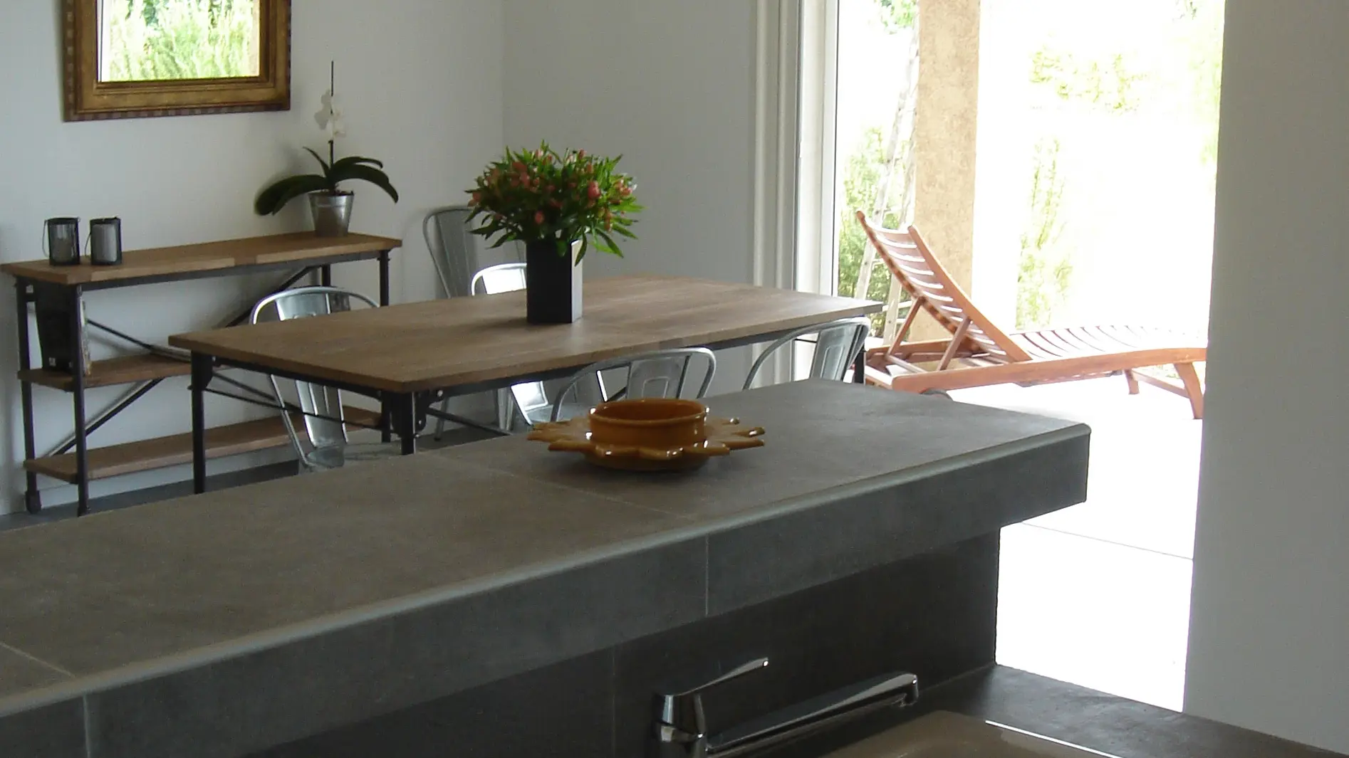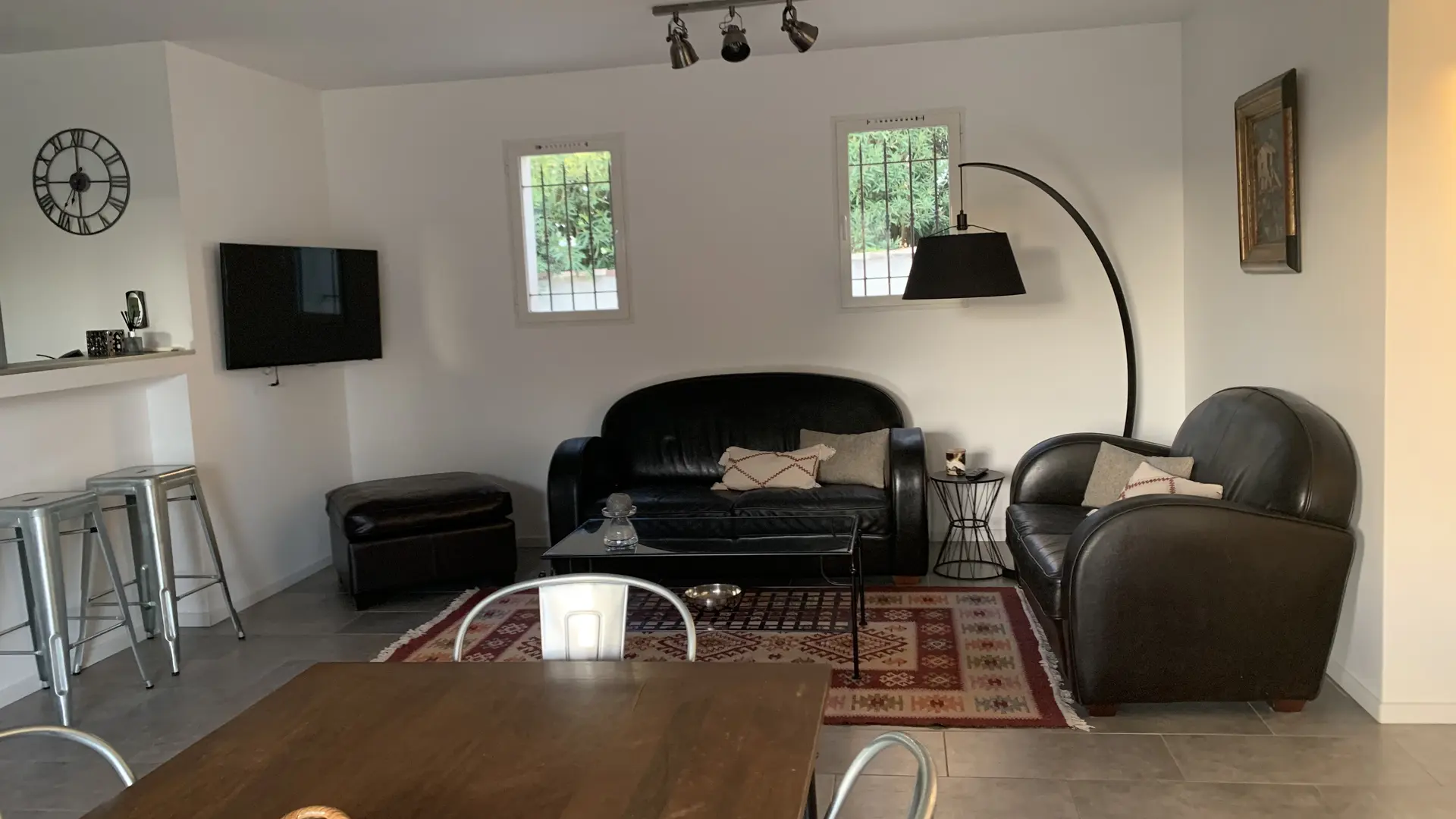 Sur plus de 96 m2, elle offre un beau séjour salon avec bar sur cuisine toute équipée ouvrant sur une terrasse sous auvent tuilé de 60m2.