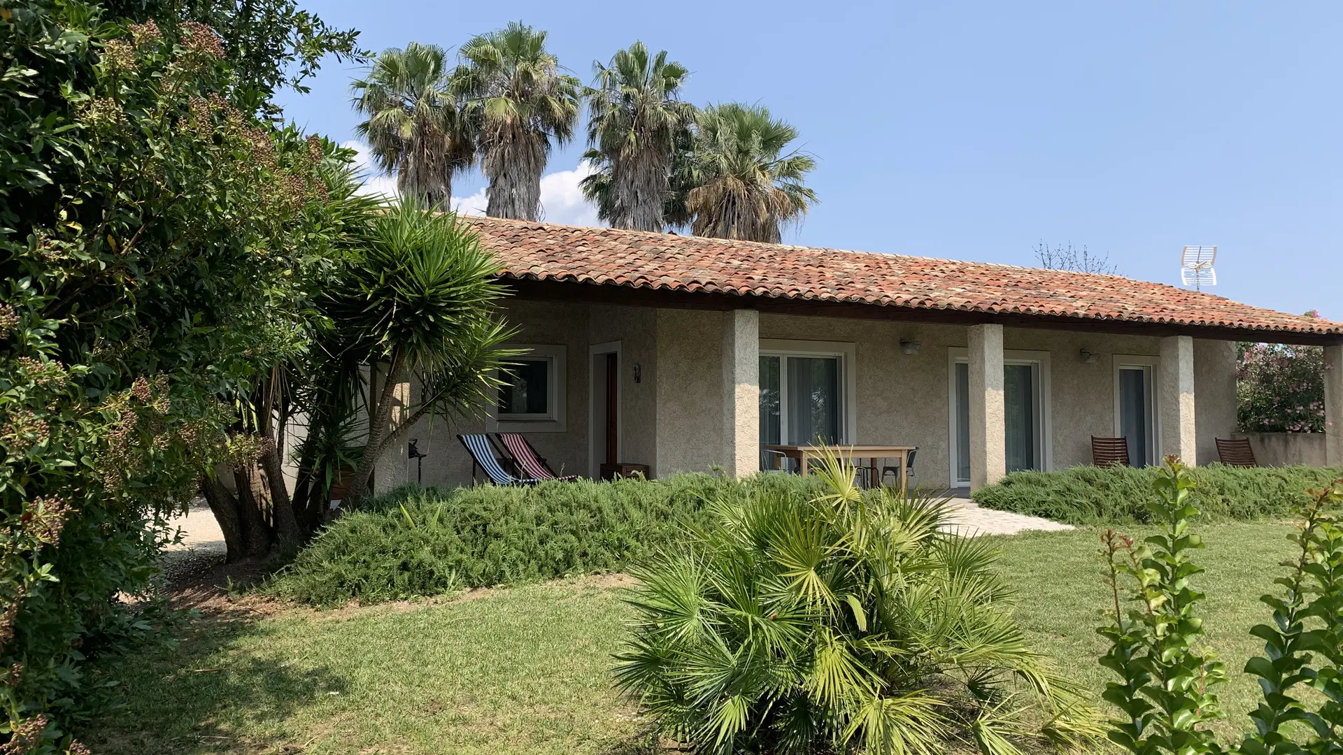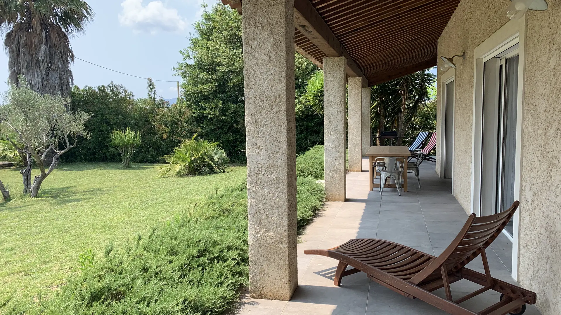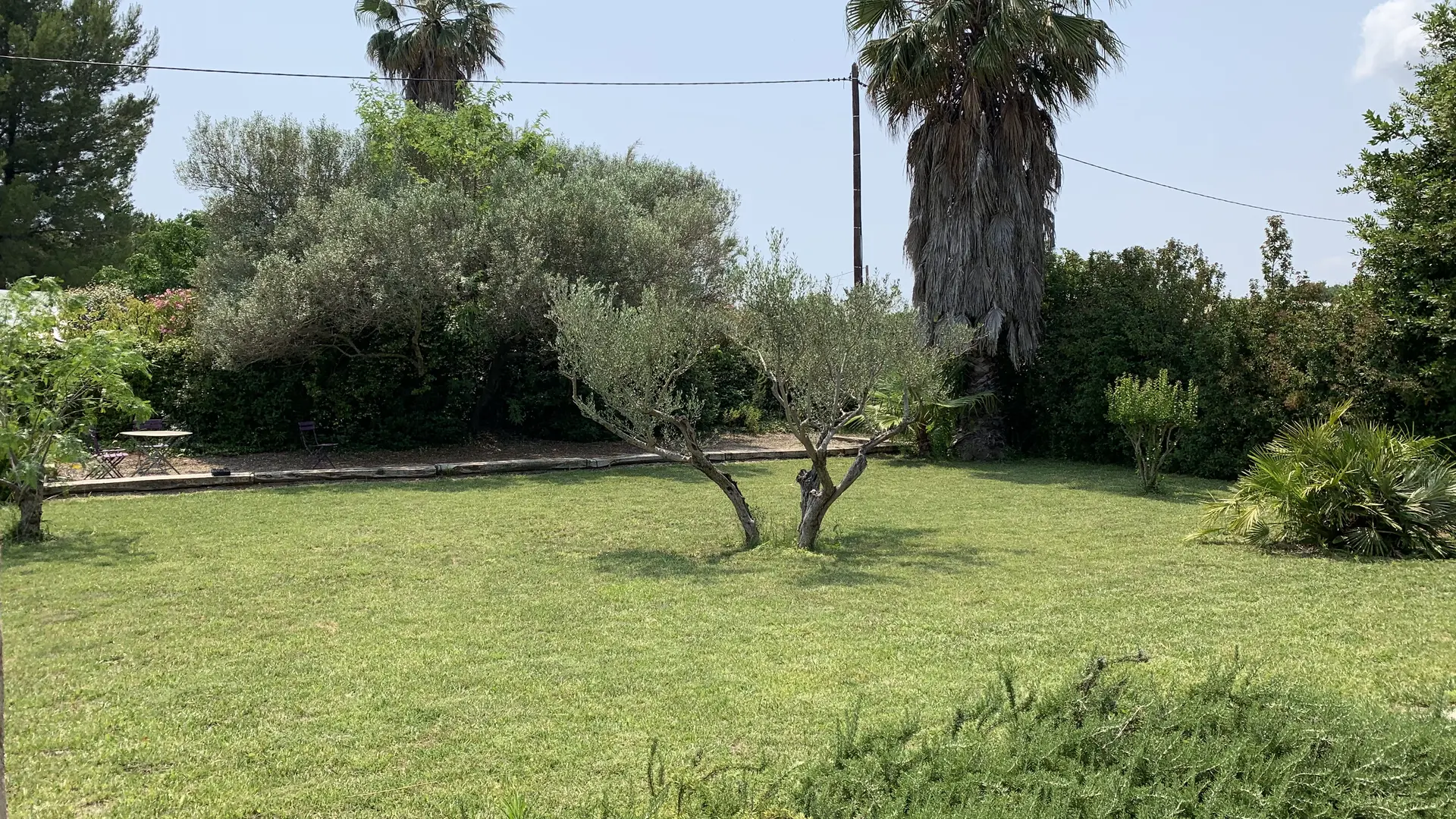 Beau jardin clos de 600 m2, pelouse, bains de soleil et chaises longues, barbecue, jeux de boules.