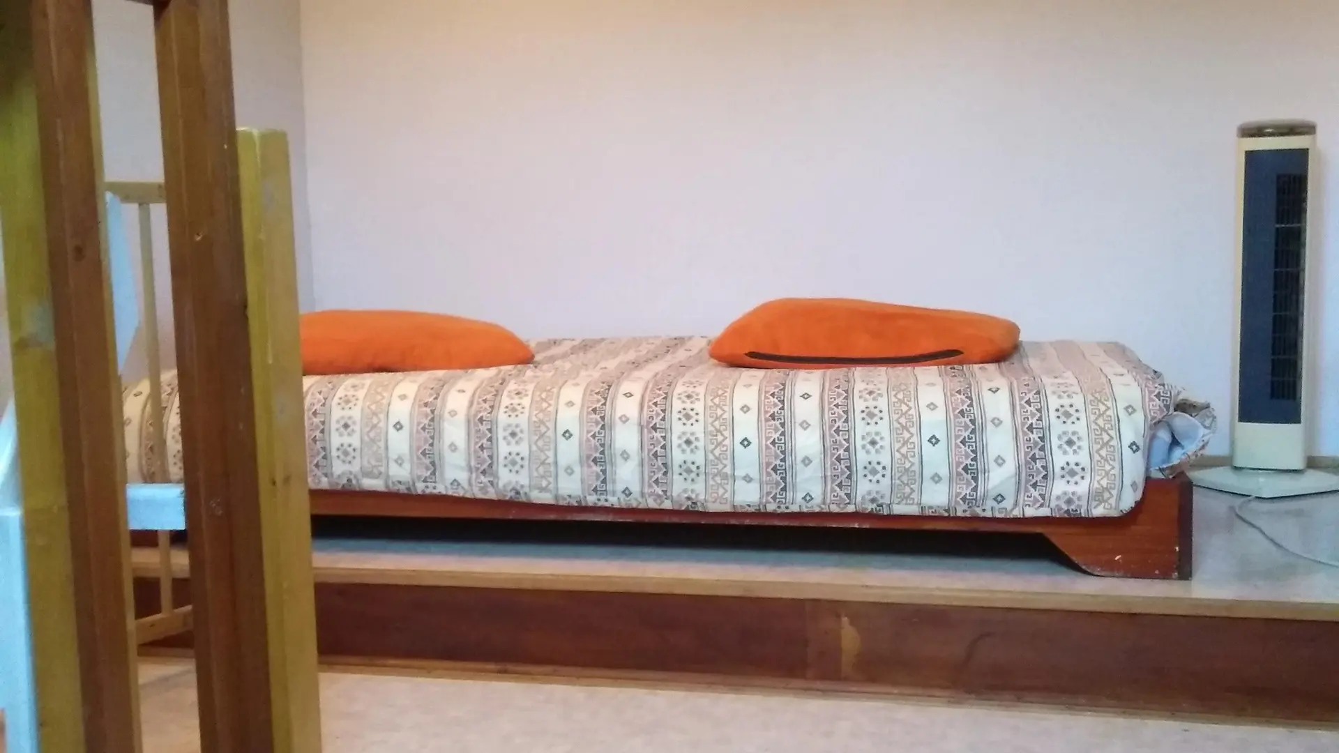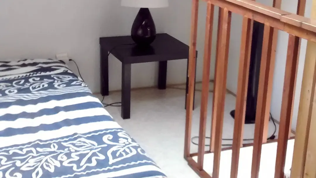 - Lit en 140, et un lit en 90 en bout de la chambre, la chambre est accessible depuis le séjour avec un escalier.