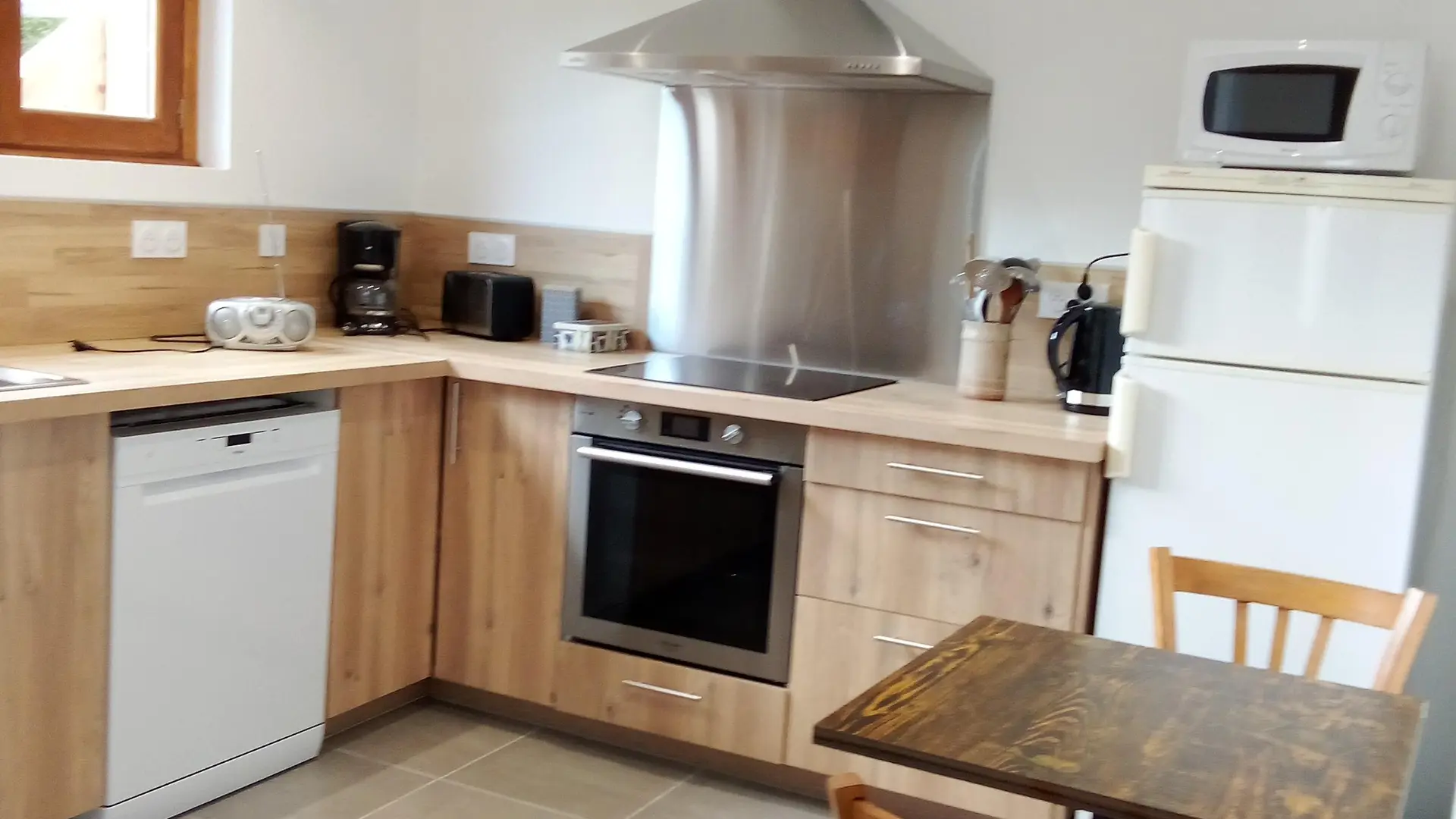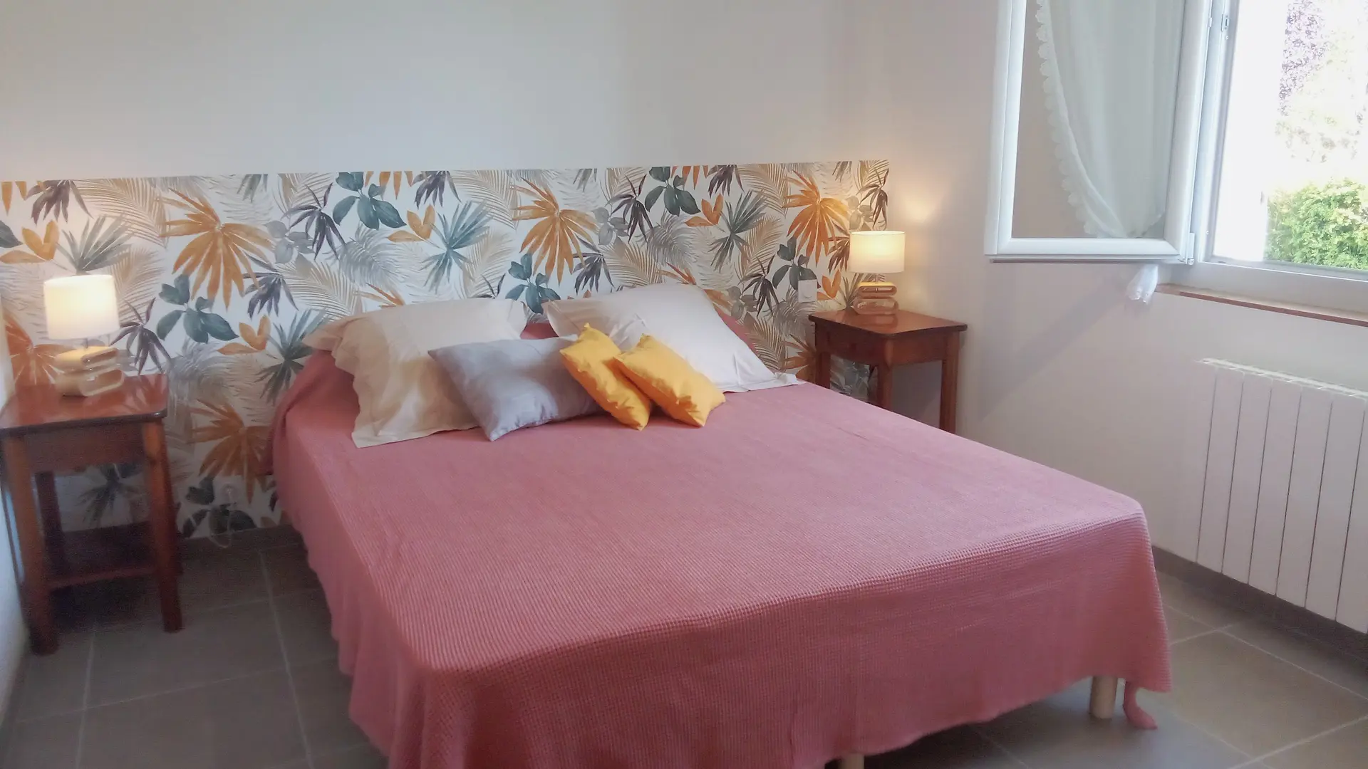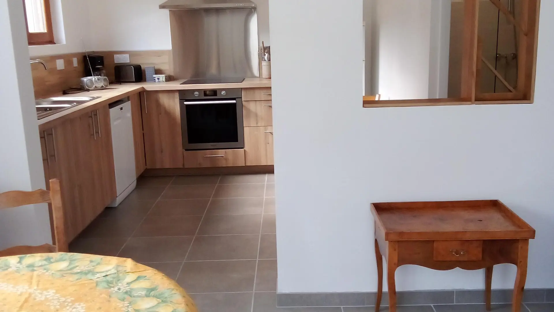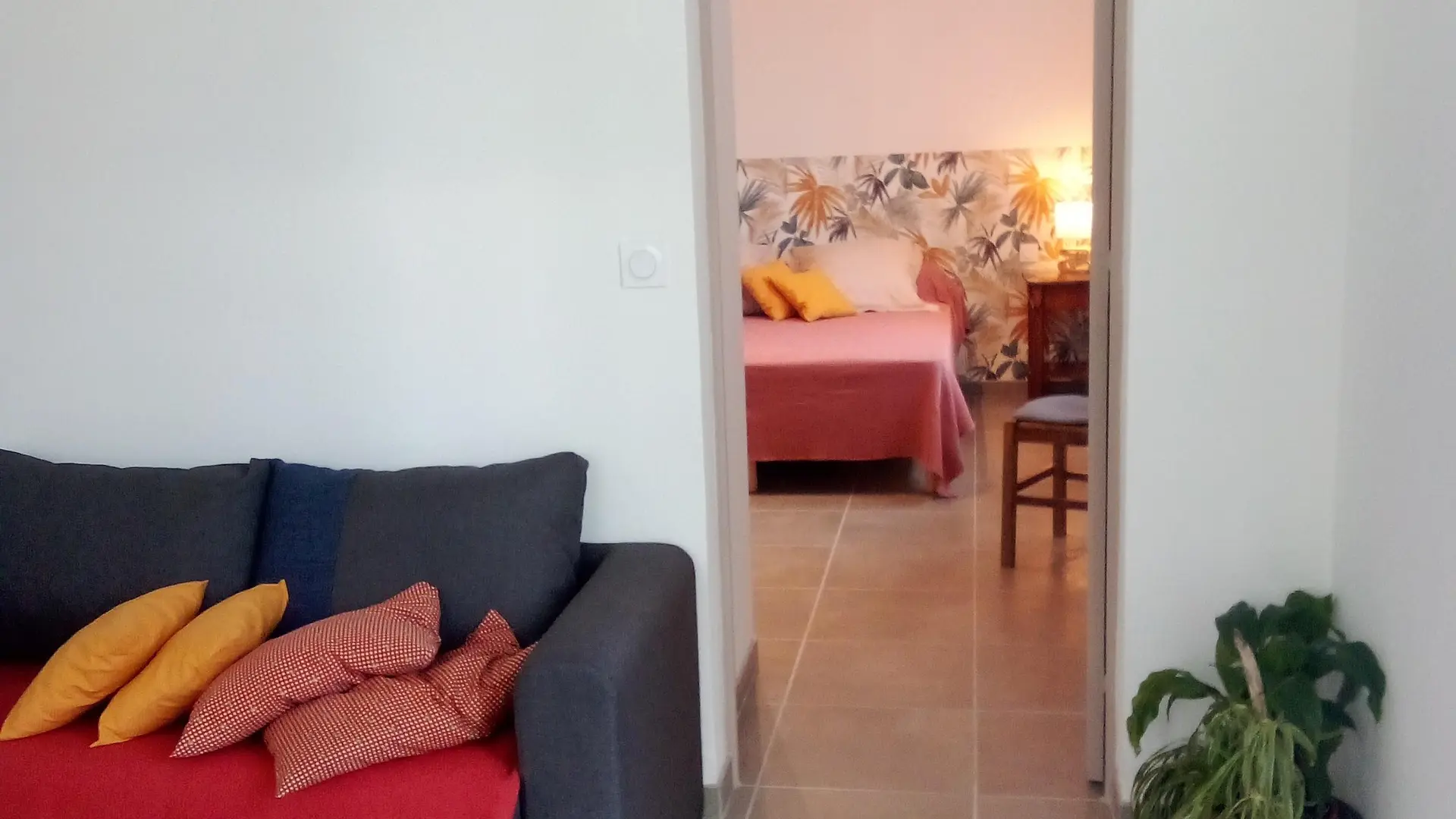 Logement de 40M2, une chambre avec un lit en 160, un séjour avec un canapé et une cuisine équipée. Espace extérieur avec pergola