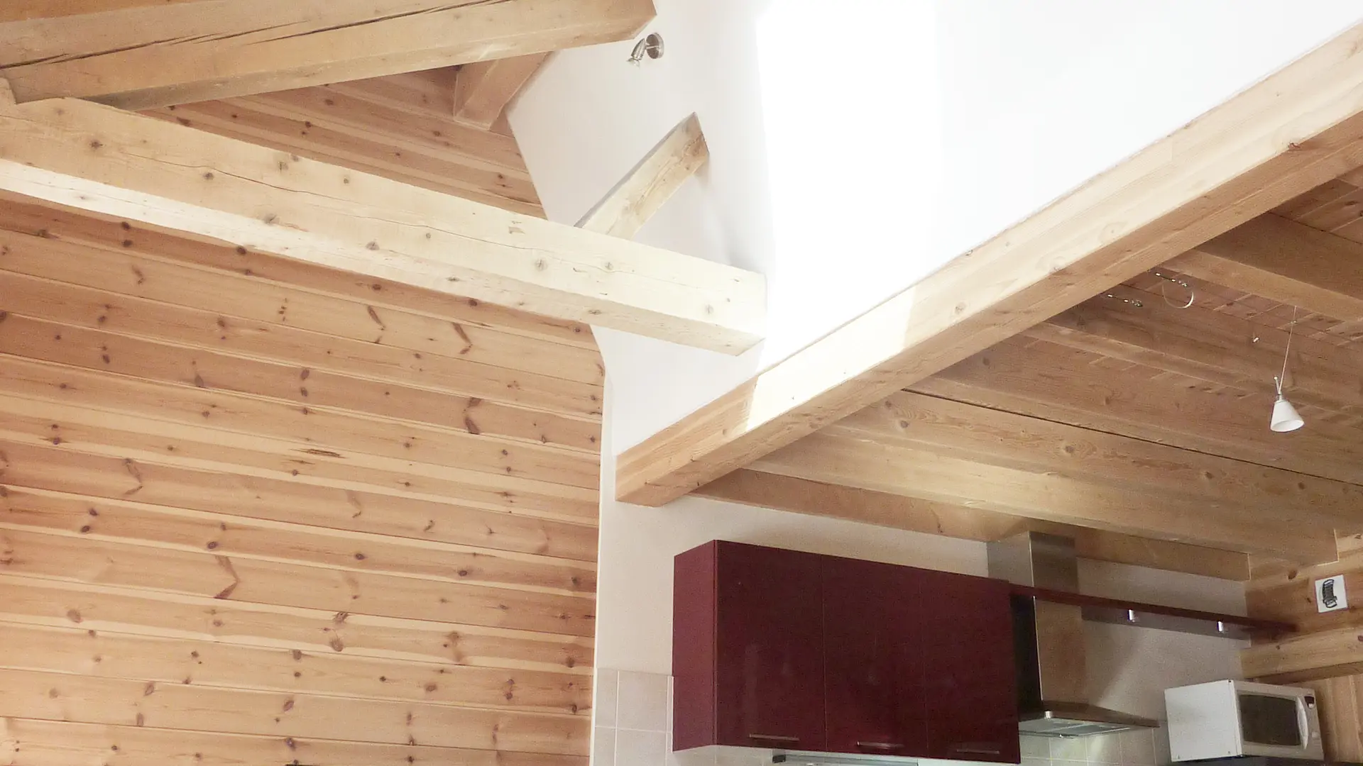 - un salon avec cuisine équipée, poêle à bois