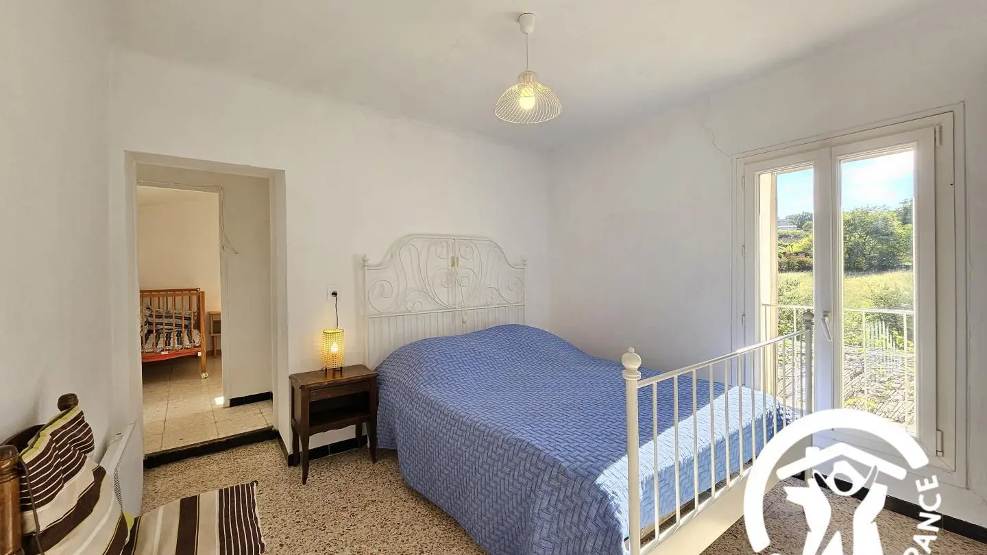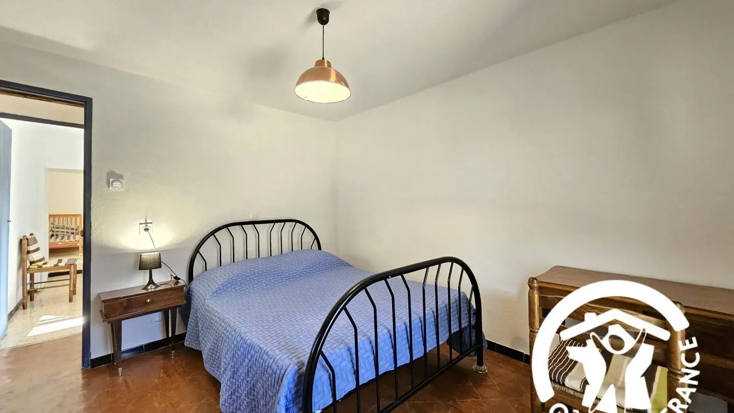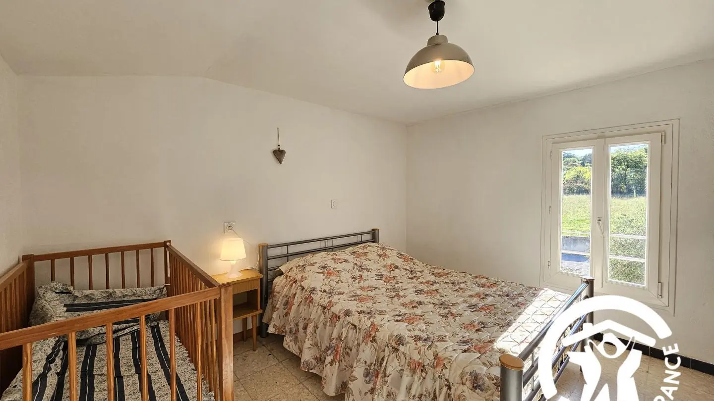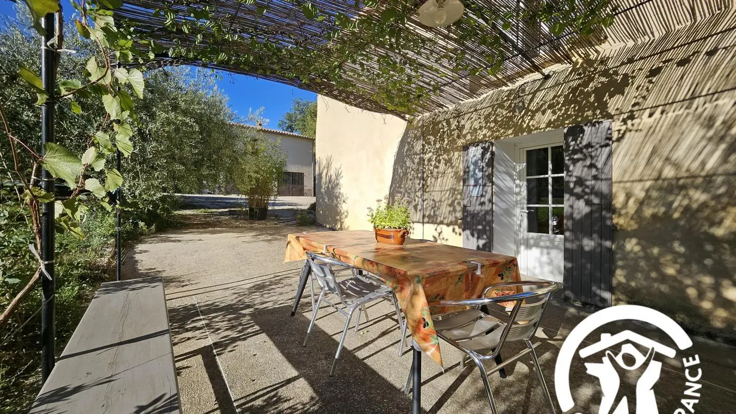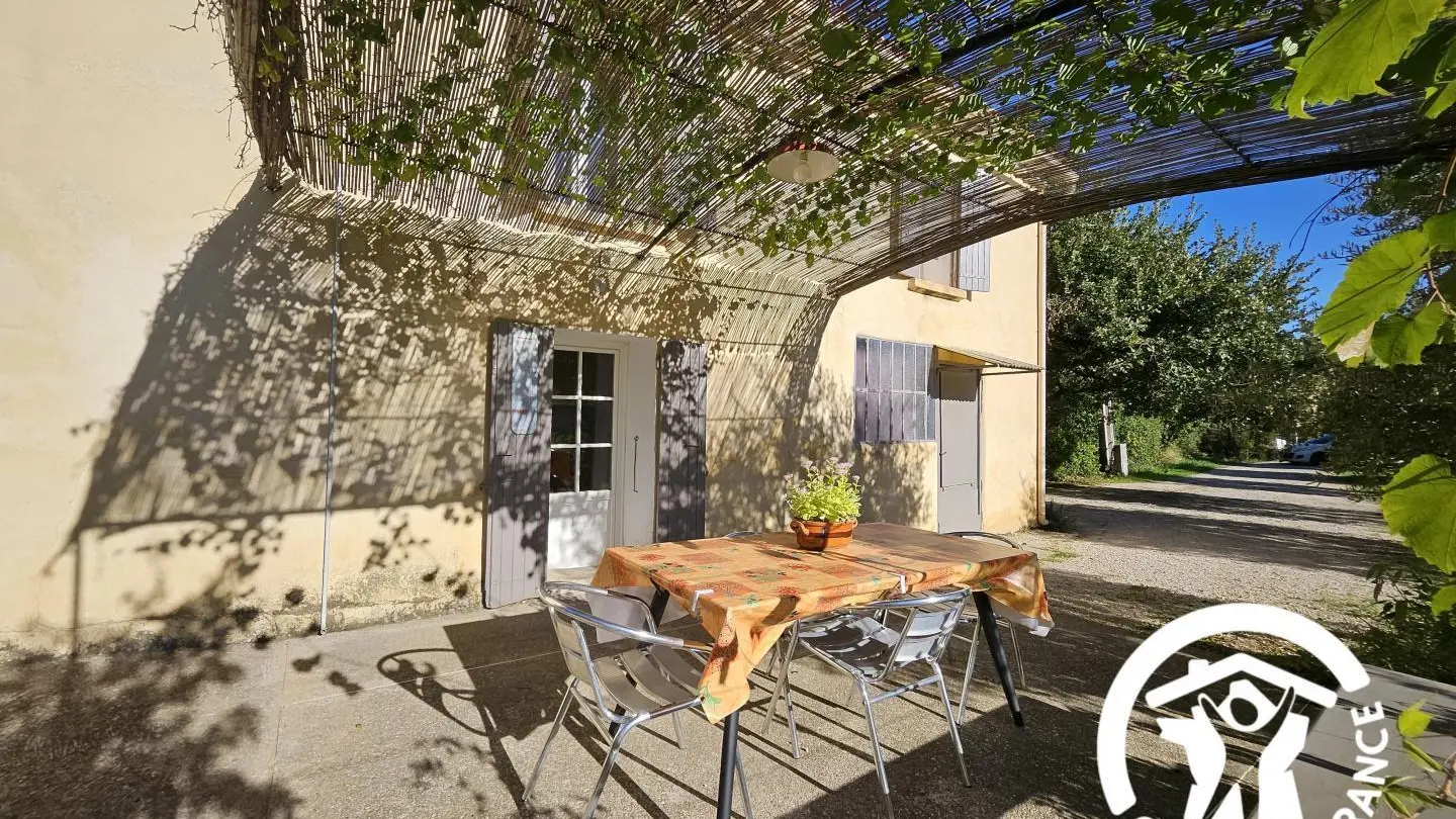 Petite ferme restaurée avec terrasse-tonnelle à l'entrée. Sur l'autre côté terrasse ombragée avec barbecue. Tables et chaises de jardin, 2 transats, 1 bain de soleil.