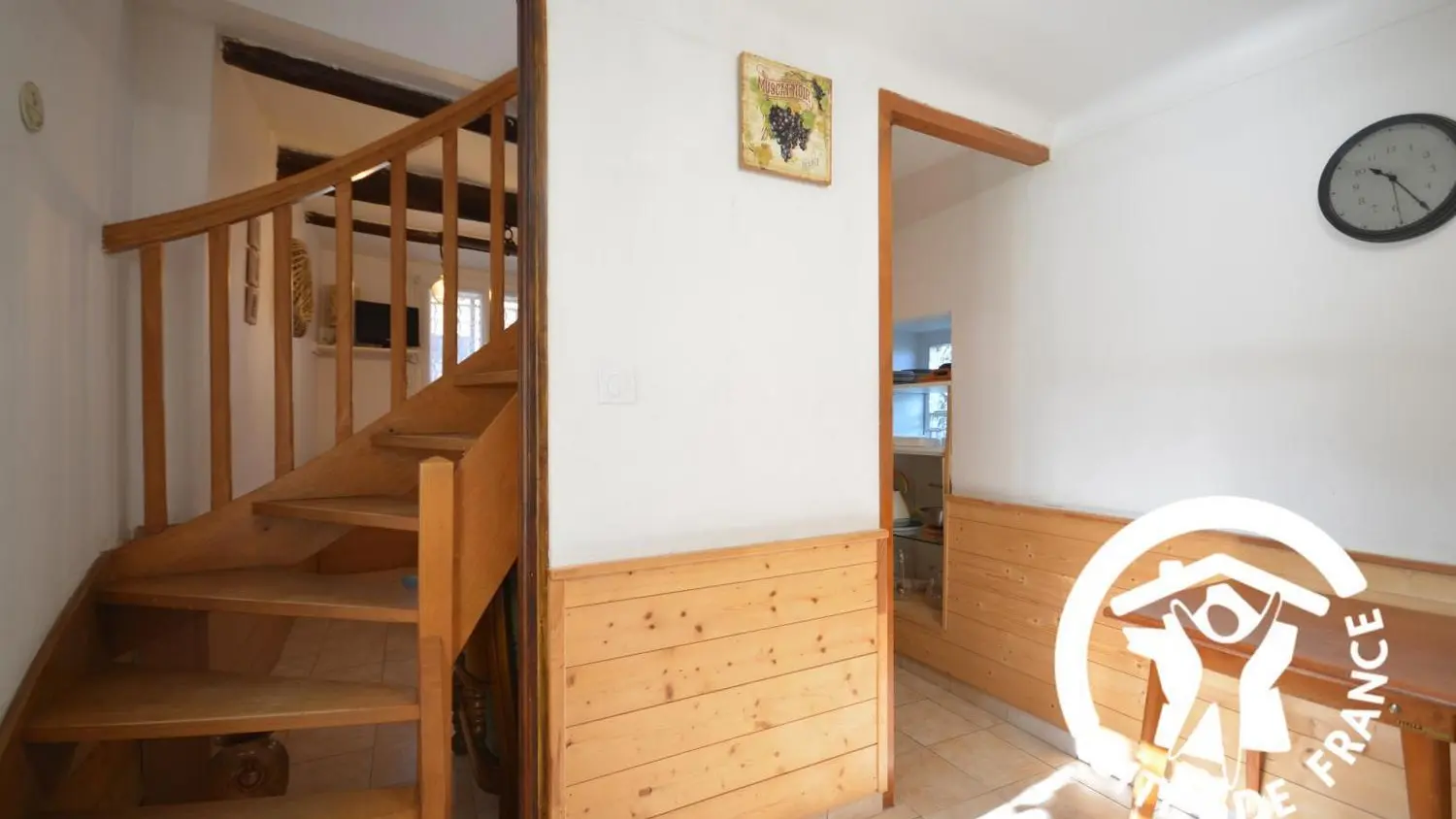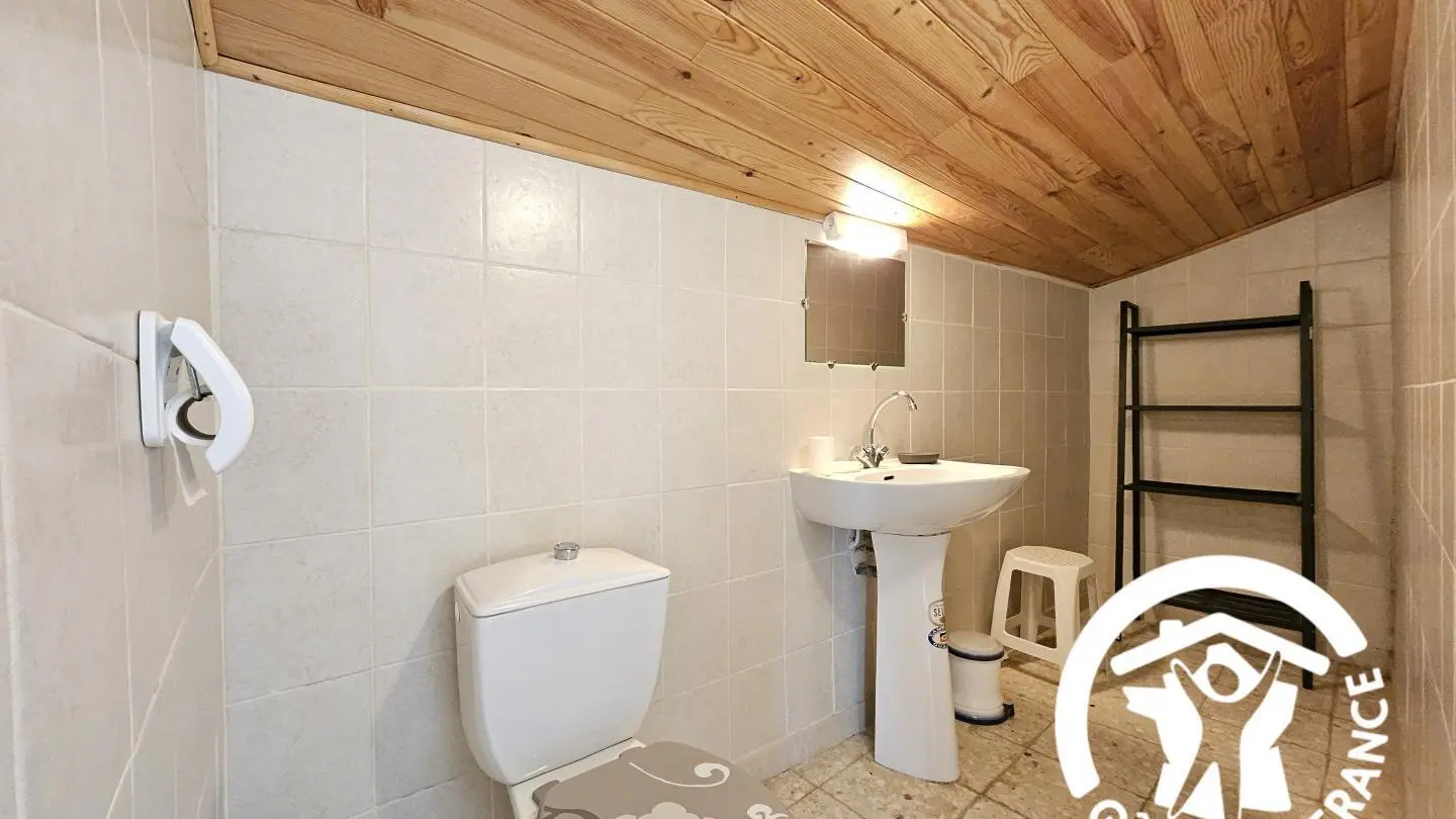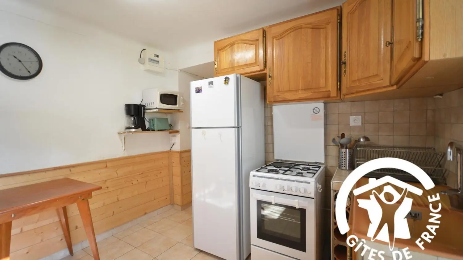 En rez-de-chaussée : cuisine (micro-ondes), lave-linge. Salle à manger, TV. salle d'eau + wc, buanderie.