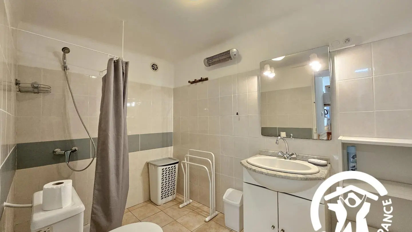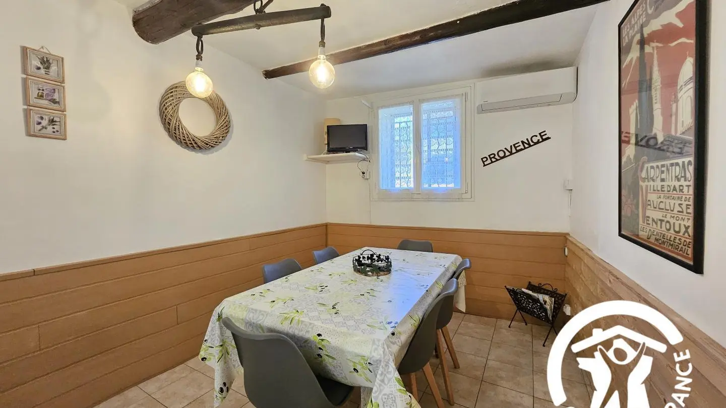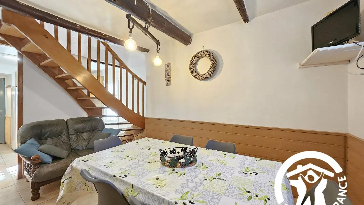 En rez-de-chaussée : cuisine (micro-ondes), lave-linge. Salle à manger, TV. salle d'eau + wc, buanderie.