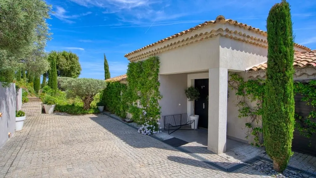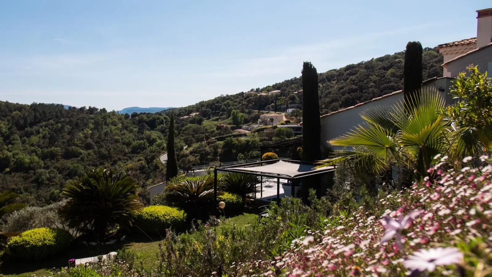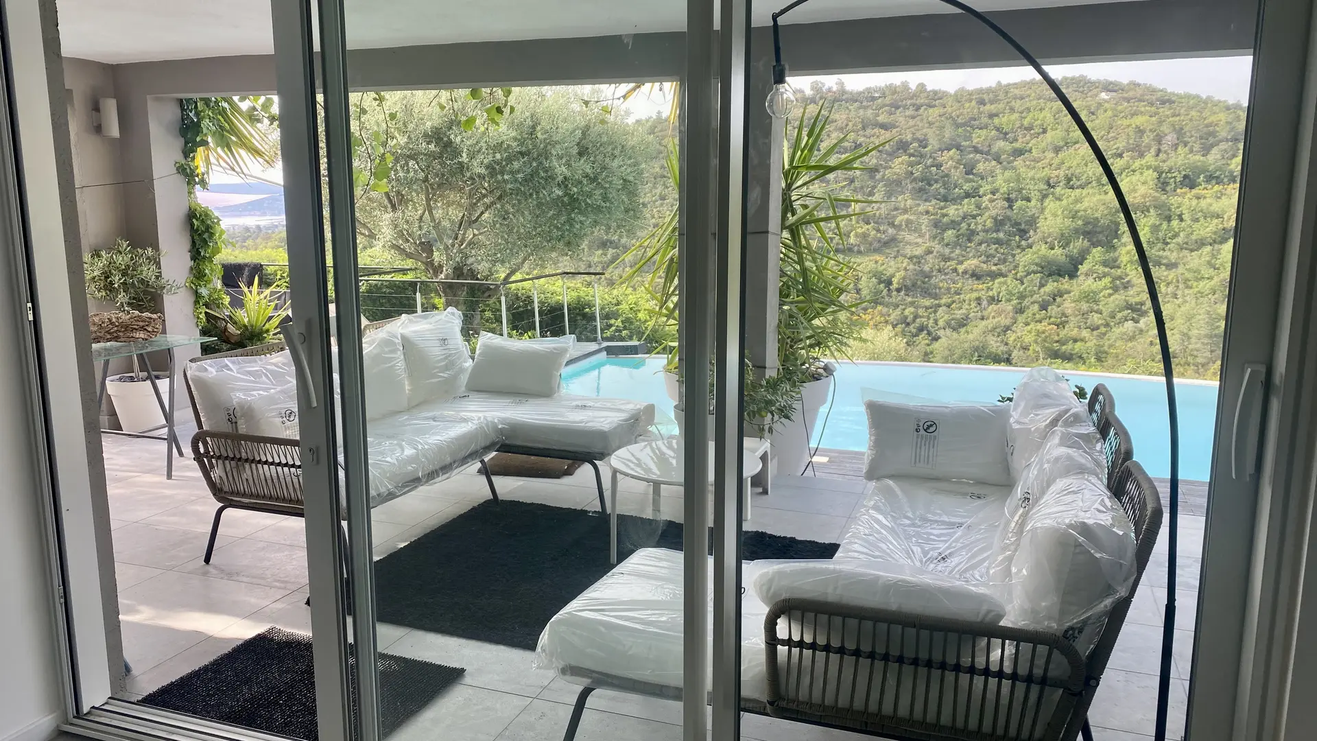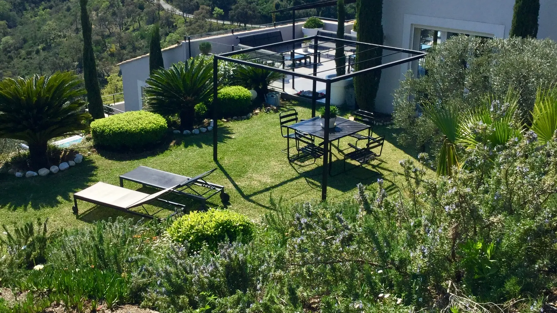 Superbe villa contemporaine dans les collines de Grimaud, louée entièrement et exclusivement à un seul client , classée 5*****, avec vue panoramique sur le golfe et le village de Saint-Tropez.
