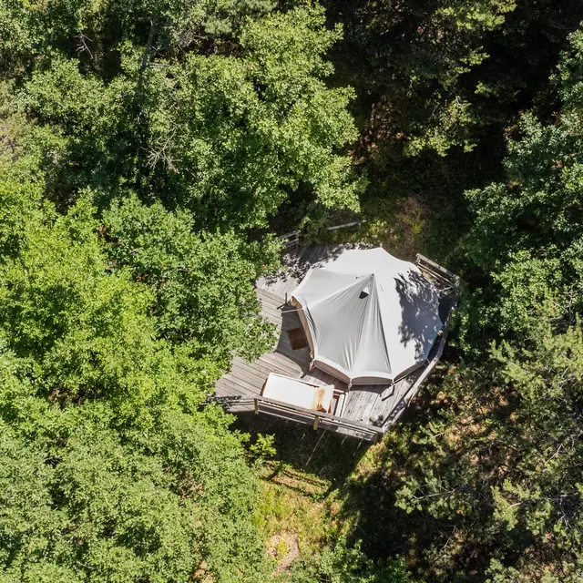 En forêt, notre tente confortablement meublée est le lieu idéal pour un moment de déconnexion ou une nuit romantique sous les étoiles. Une expérience simple et éco-responsable avec sa douche solaire et ses toilettes sèches.