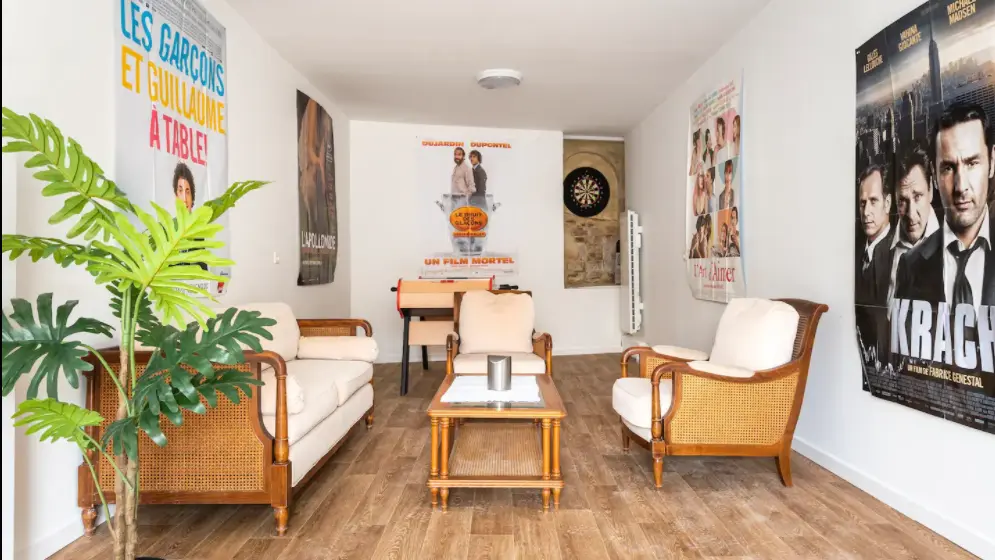 - La salle de séjour avec WIFI gratuit fibre, TV grande taille lecteur DVD et large collection de DVD.