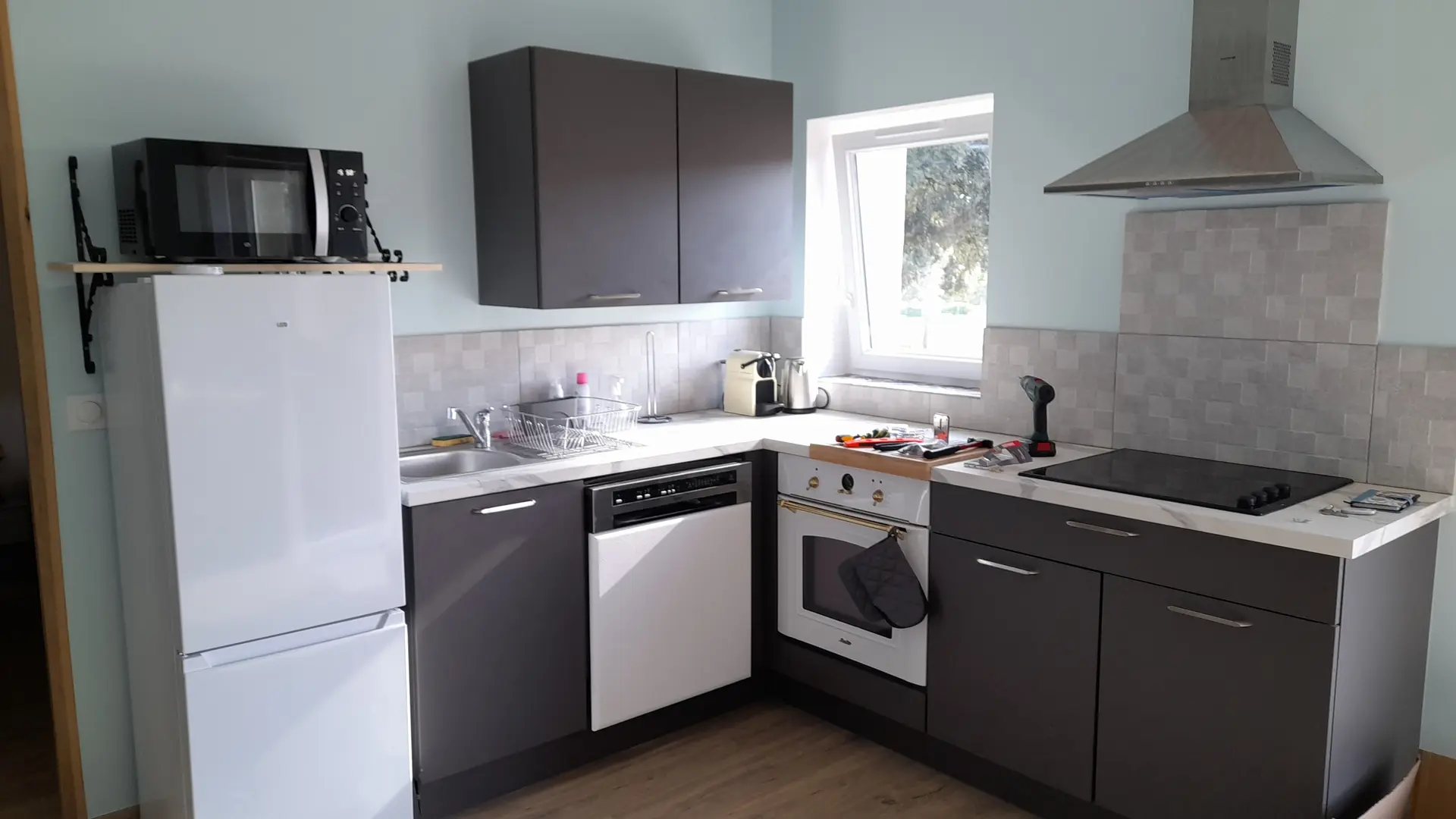 Cuisine neuve faîte sur mesure pour l'appartement et entièrement équipée.