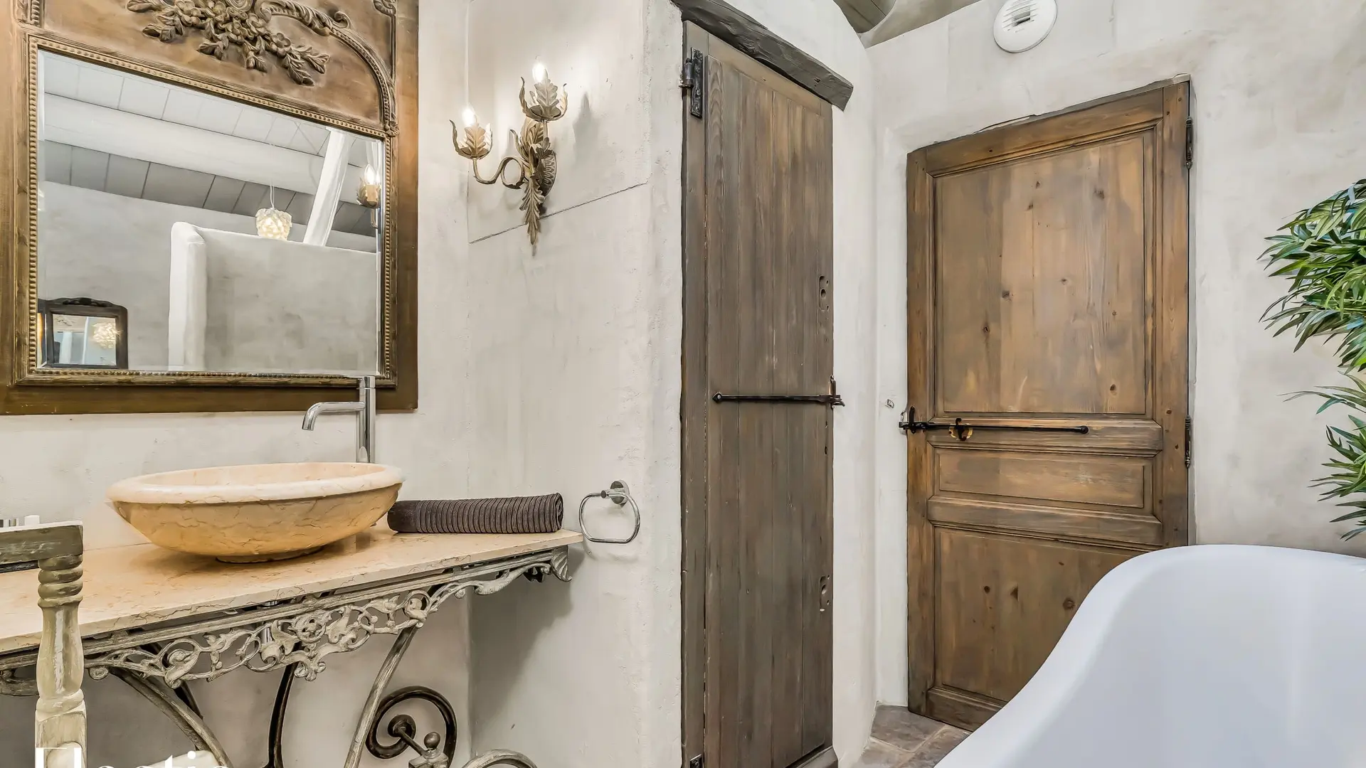 ️ La grande chambre est dotée d’un lit en 160x200 cm, de plusieurs sources d’éclairage, d’un miroir et d’une fenêtre donnant sur le Luberon, agrémentée d'une chaise. La salle de bain attenante comprend une baignoire, une vasque avec un miroir, et dispose d’un accès direct aux toilettes.