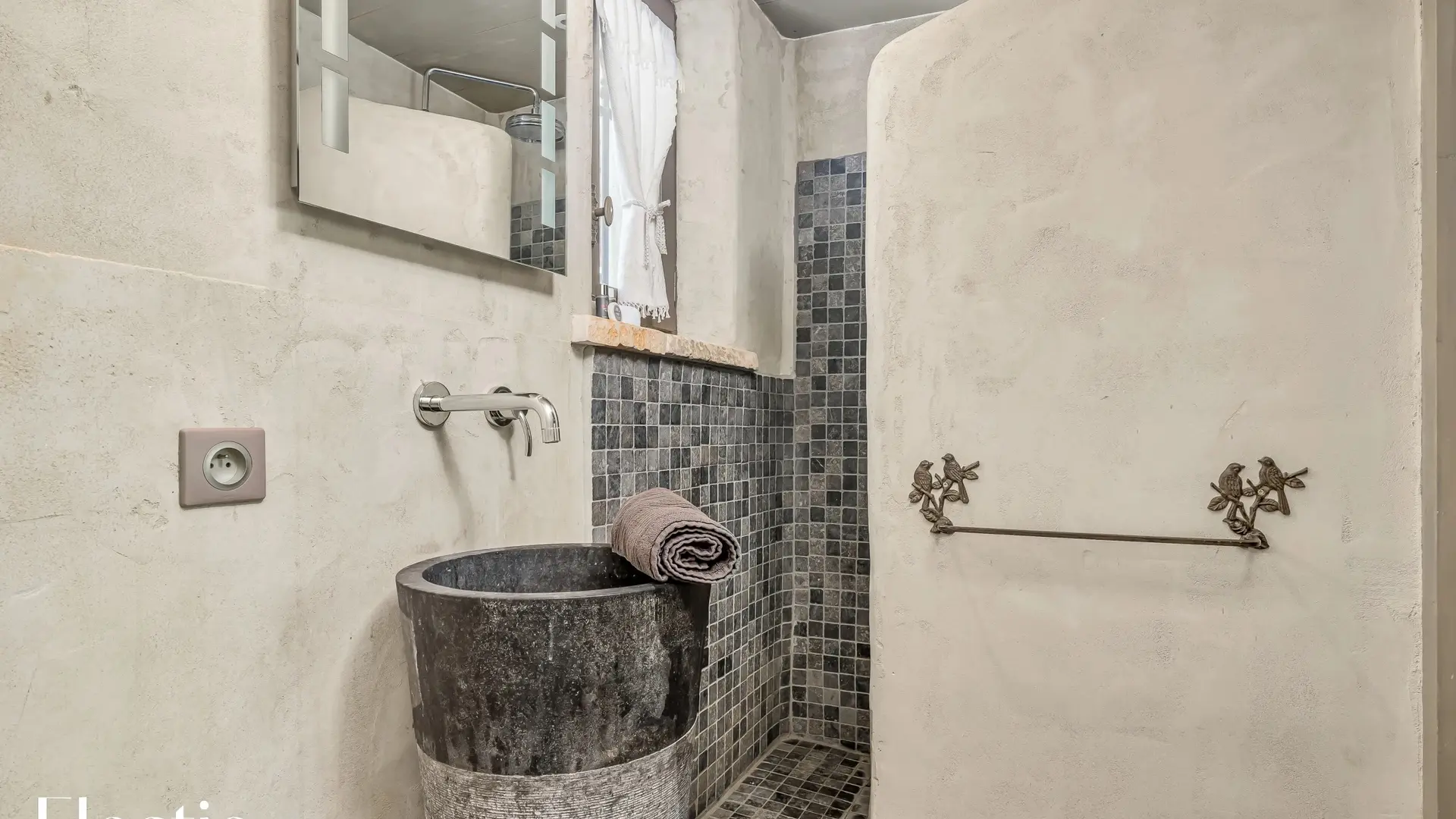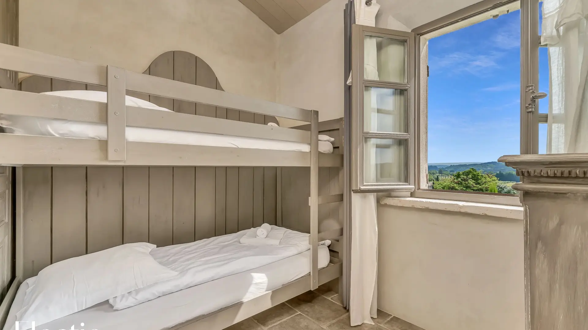 La deuxième chambre, plus petite, est équipée de deux lits superposés en 90x190 cm et d'une fenêtre. Elle dispose de sa propre salle d’eau, accessible directement depuis la chambre, avec une douche à l'italienne, un lavabo en pierre et un miroir.