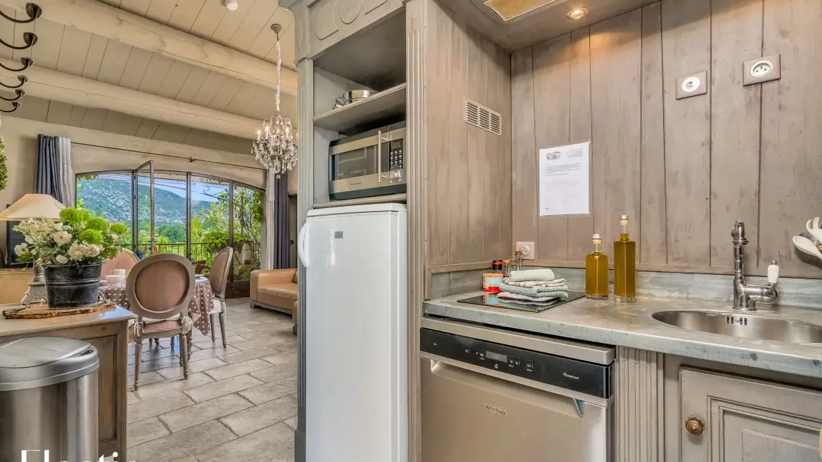☀️ La pièce de vie, avec sa belle hauteur sous plafond, comprend un salon avec un canapé face à la télévision et une grande porte-fenêtre ouvrant sur la terrasse, qui laisse entrer une belle lumière naturelle. Une table en bois avec quatre chaises complète cet espace convivial. La cuisine attenante, entièrement équipée, dispose de plaques à induction, d’un lave-vaisselle, d’un réfrigérateur encastré, d’une bouilloire, d’un grille-pain, d’une machine à café filtre et expresso, ainsi que d’un four micro-ondes multifonction. Tout le nécessaire, vaisselle et verrerie, est fourni pour que vous puissiez préparer et partager des repas en toute simplicité.