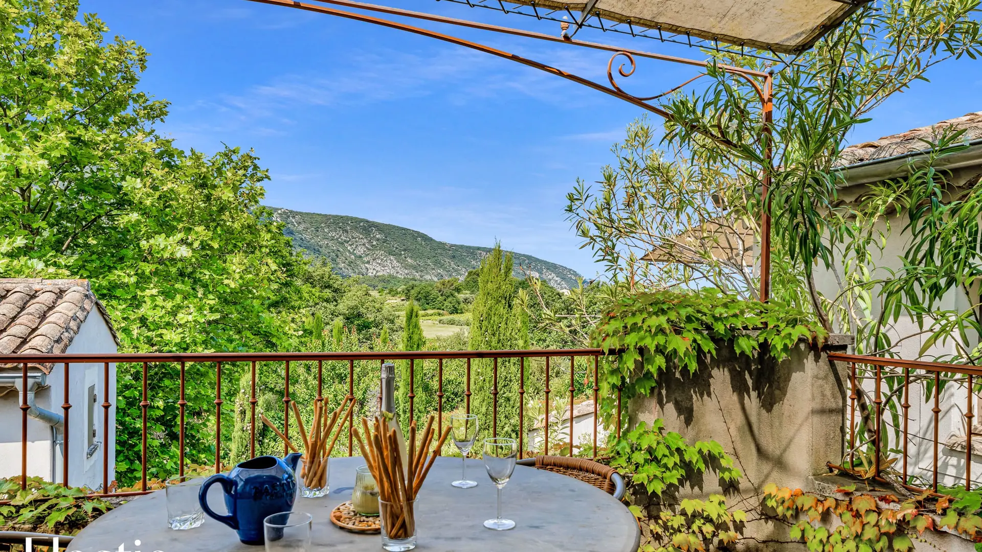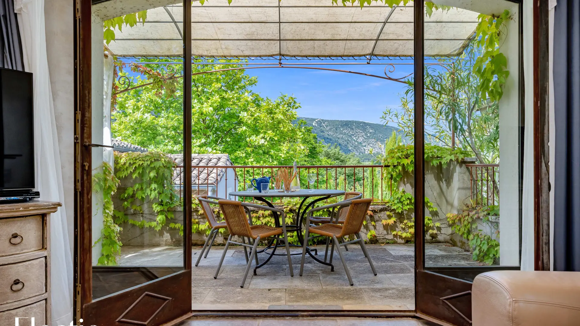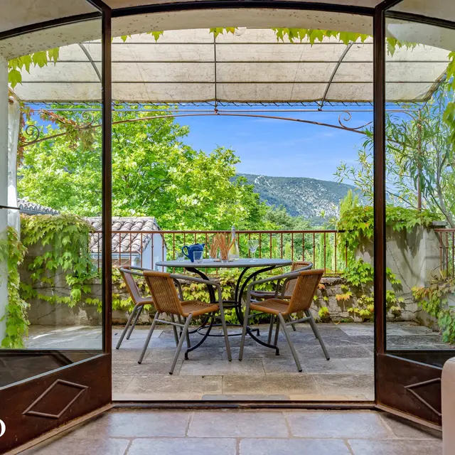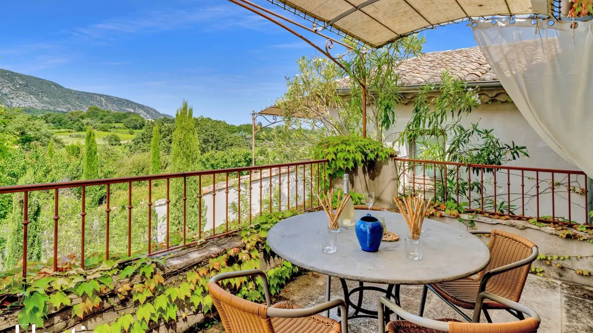 La terrasse privée de 12 m² offre une vue imprenable au sud-sud-ouest sur la campagne environnante et le Mont Ventoux. Elle est aménagée avec une table en métal et quatre chaises en osier, idéale pour savourer un petit-déjeuner en plein air ou un apéritif au coucher du soleil, tout en admirant la vue panoramique sur le Luberon.