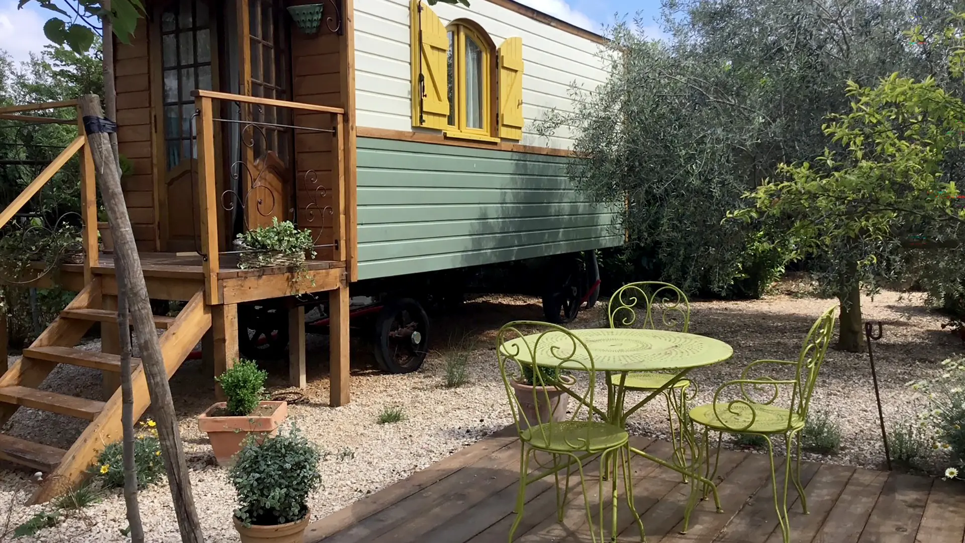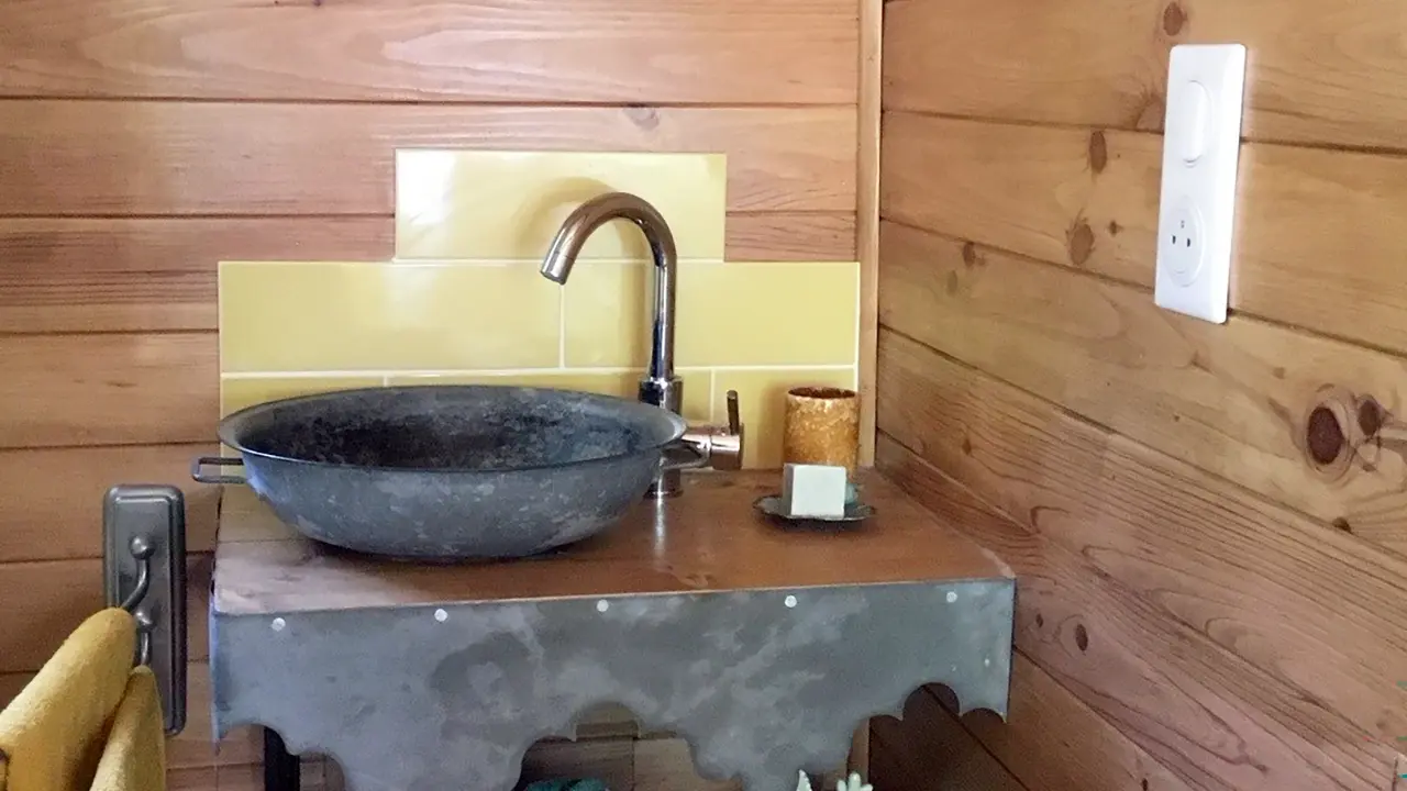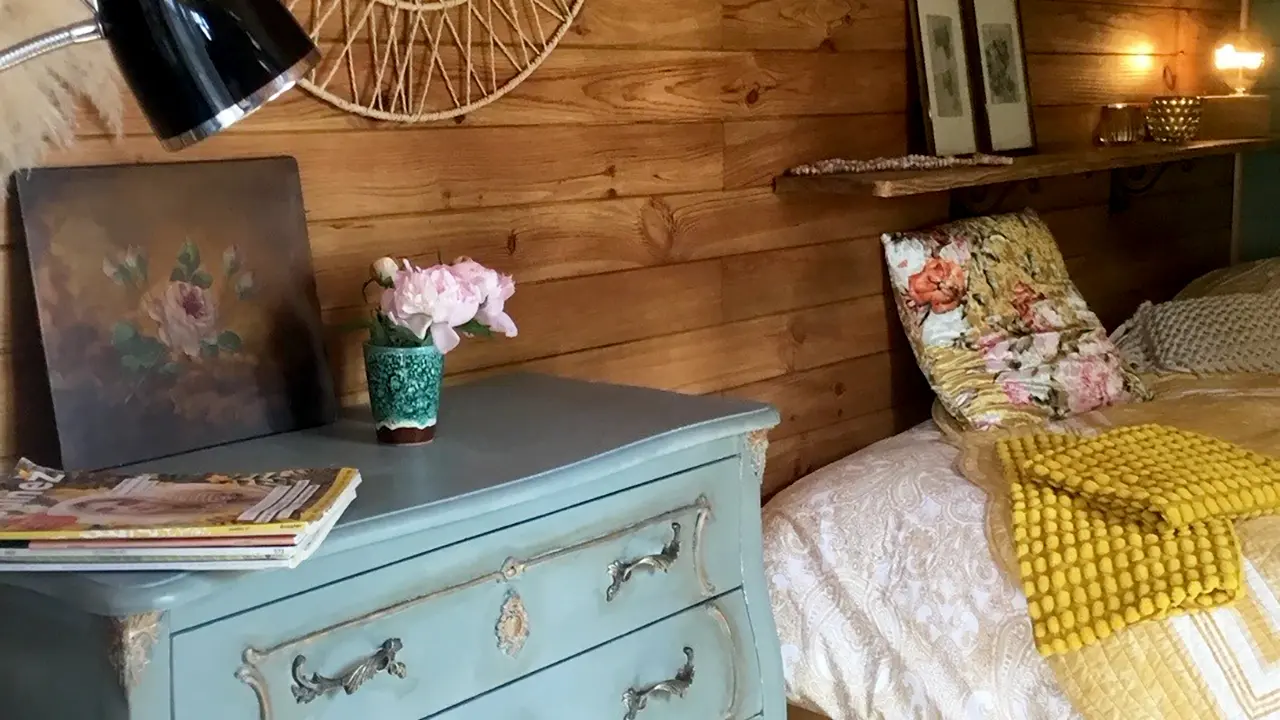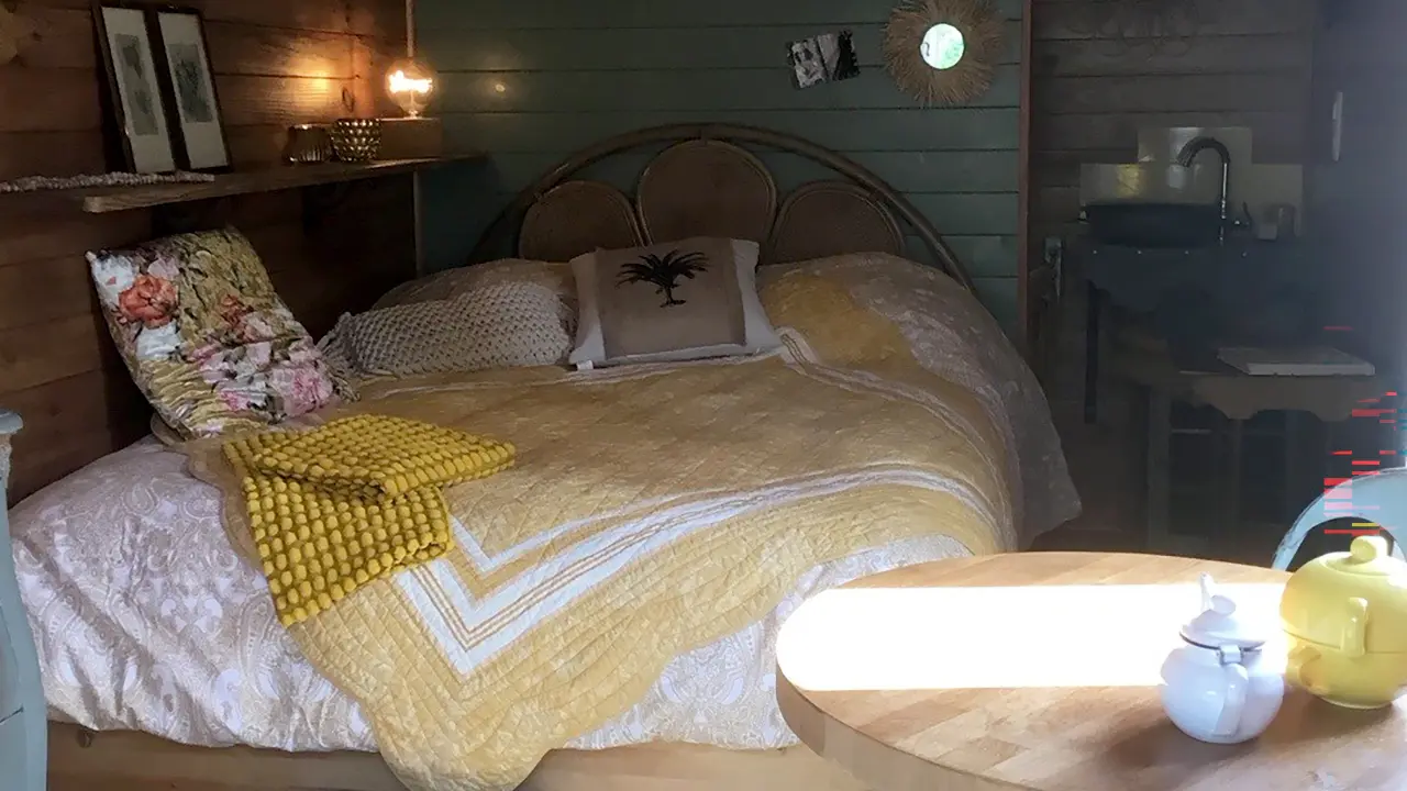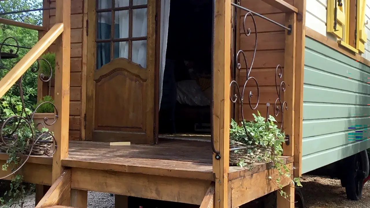 Chambre d'hôtes dans une roulotte, située dans un petit jardin. Jolie chambre, coin petit déjeuner, lavabo et douche. Toilettes sèches à l’extérieur.