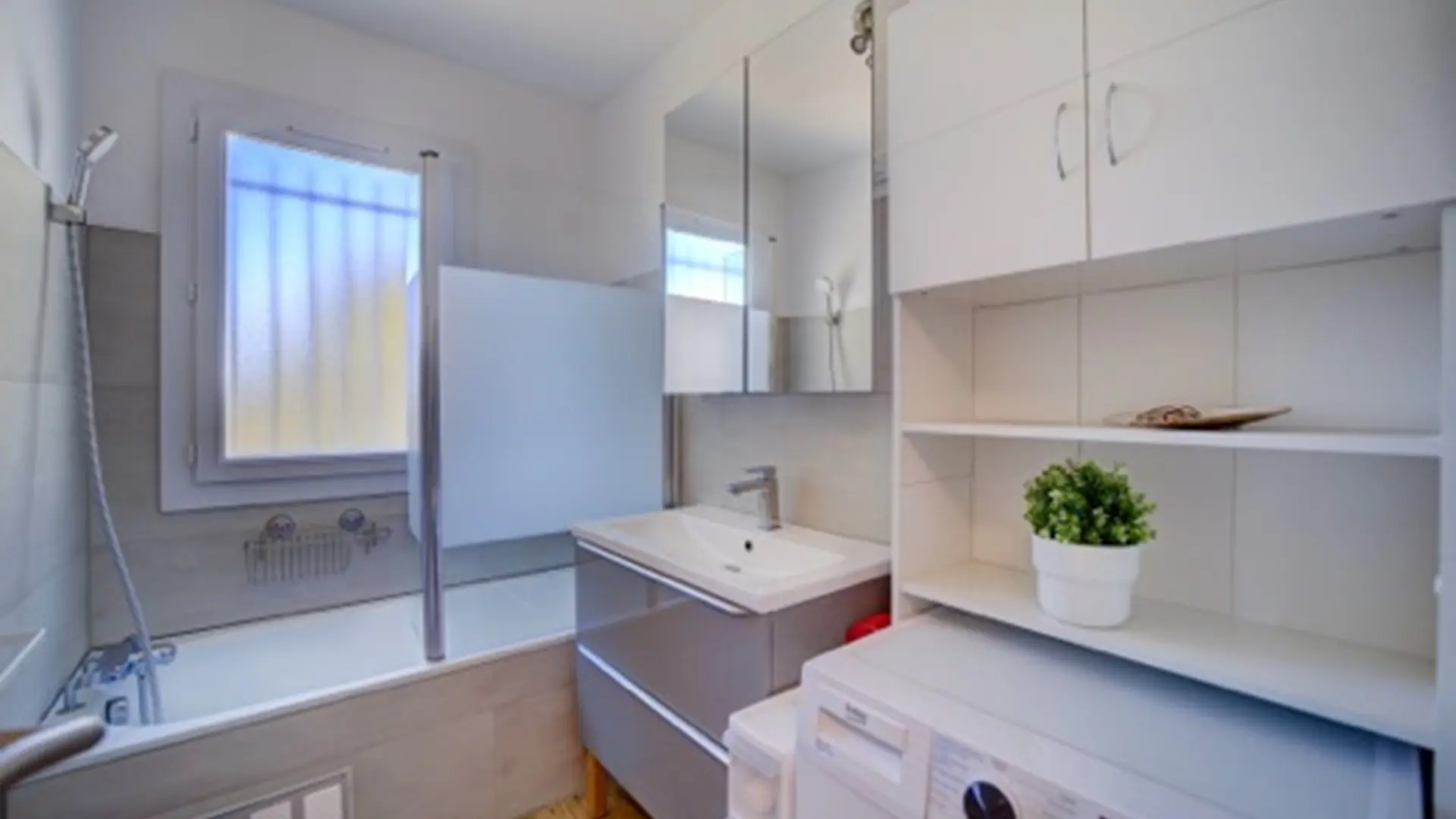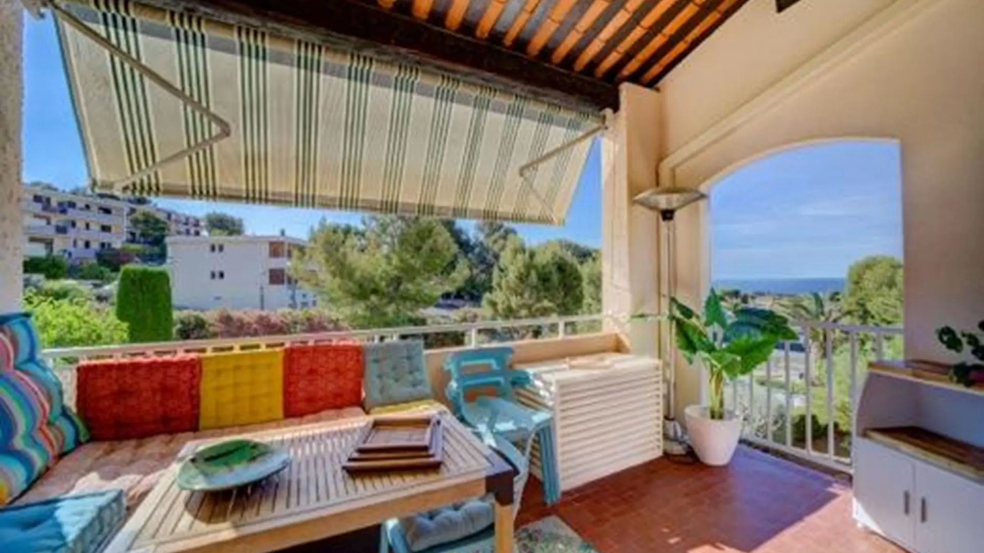 Salon lumineux ouvrant sur une belle terrasse vue mer, cuisine toute équipée, salle de bain, WC, séjour, placards