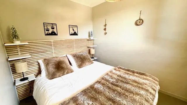 Il se compose d'une entrée, un coin montagne avec placard et un lit superposé avec 2 couchages, une cuisine aménagée et équipée. Un salon avec son coin repas, avec une table et 4 chaises, une télé, une table basse, un canapé, une chambre indépendante avec un lit 180/200, une commode et une étagère.