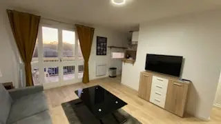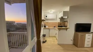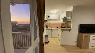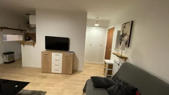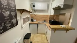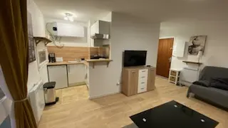 Le studio dispose d 1 pièce à vivre, d 1 kitchenette équipée de four micro ondes, 1 plaque de cuisson, hotte aspirante, 1 canapé convertible neuf deux places avec une bonne literie, 1 BZ pour deux personnes, 1 réfrigérateur, 1 sèche cheveux, 1 aspirateur, 1 poubelle de Trie,