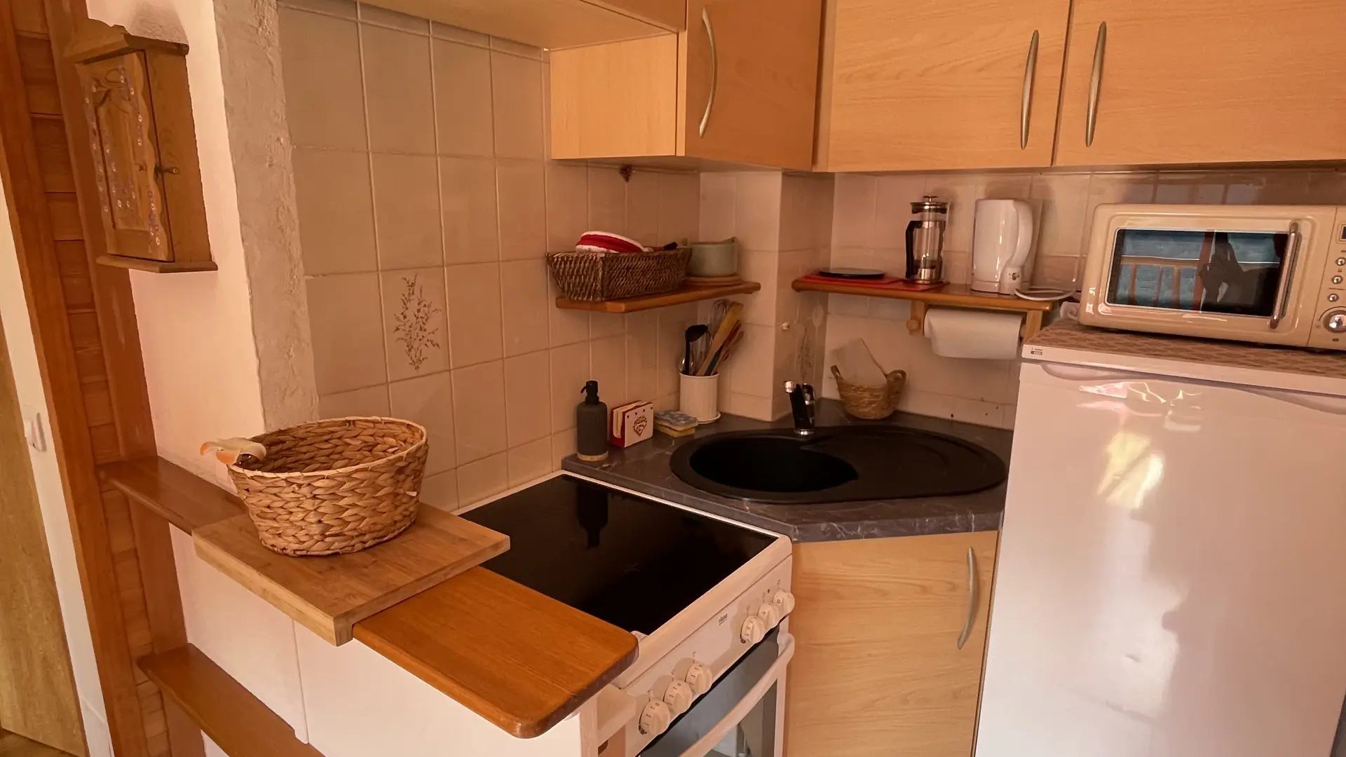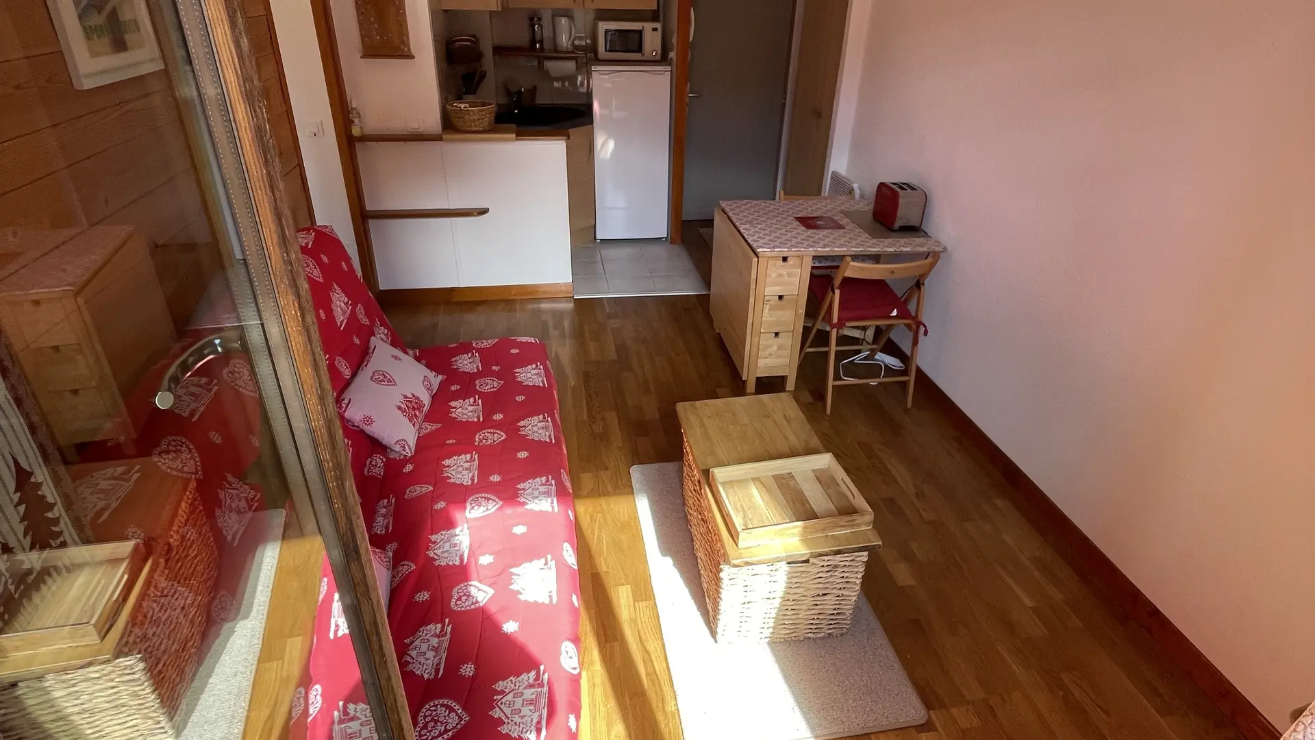 - Un salon ouvert sur la cuisine avec un canapé clic-clac en 140x190