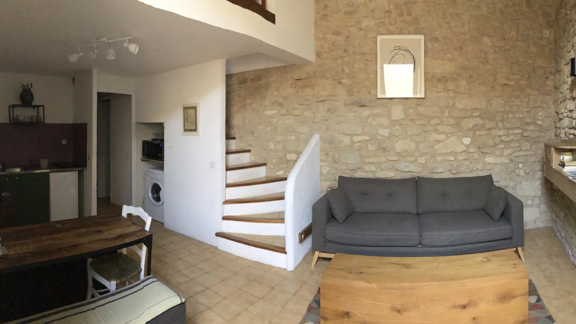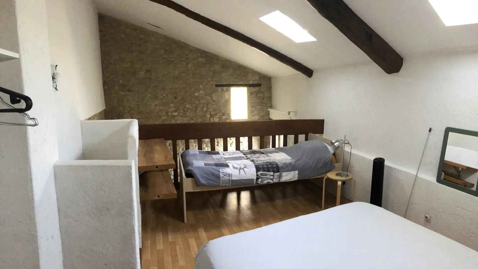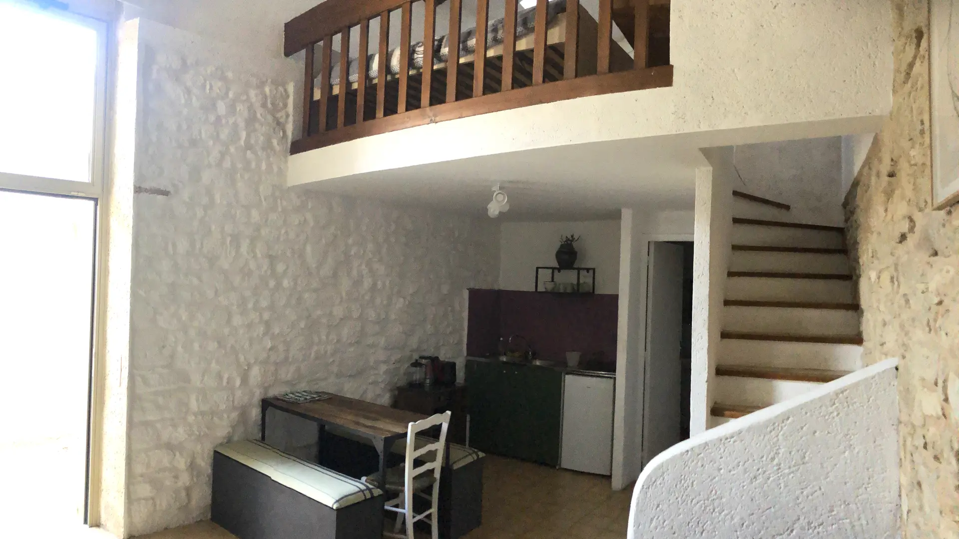 Accès indépendant en rez-de chaussée, il se compose d'une grande pièce avec coin cuisine, plaque induction , four mixte , réfrigérateur. Une salle à manger et coin salon avec un canapé convertible 140X200 cm en dépannage, une salle d'eau. A l’étage en mezzanine, un grand lit de 140cm et 1 lit de 90cm , une penderie .