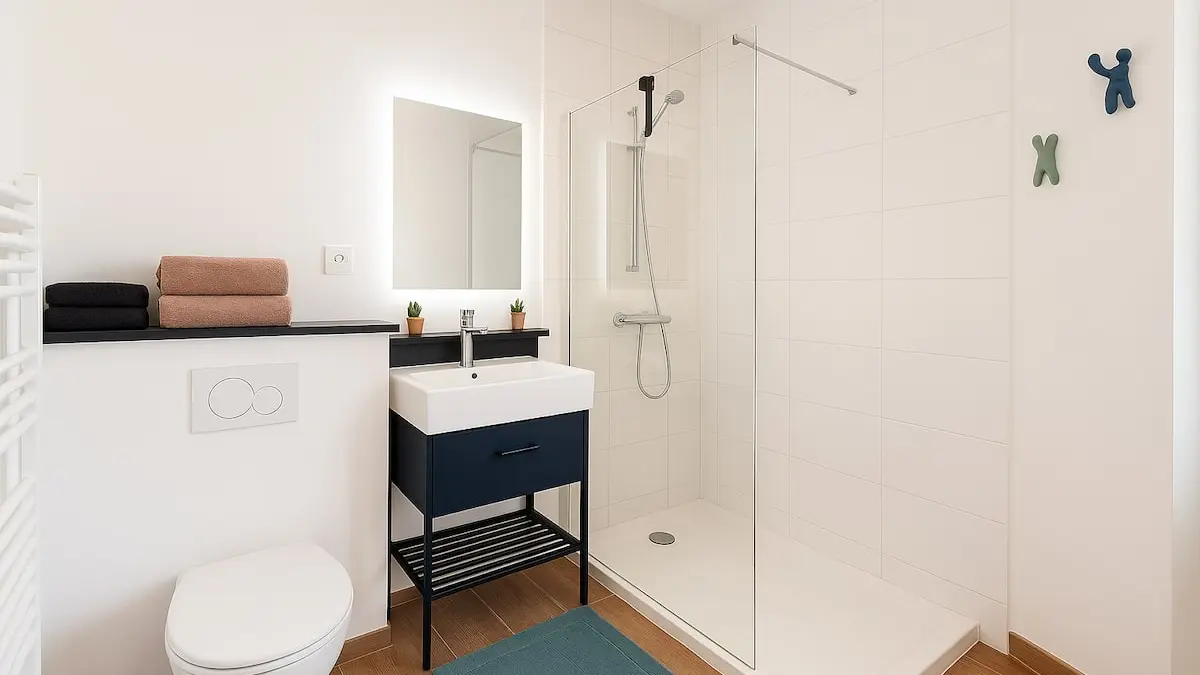 Tout est à proximité : boulangerie, pharmacie, boucherie, laverie, poste et supermarché.