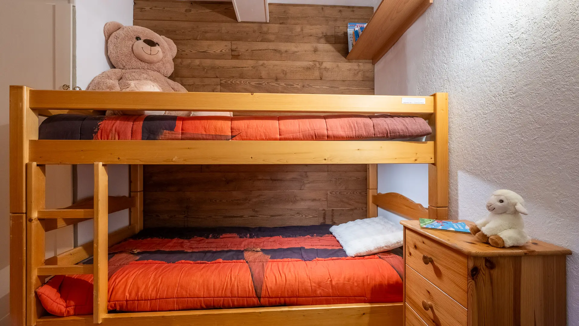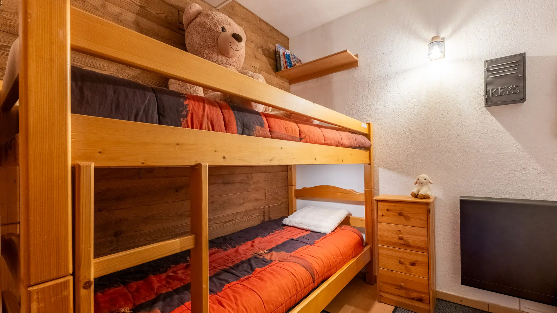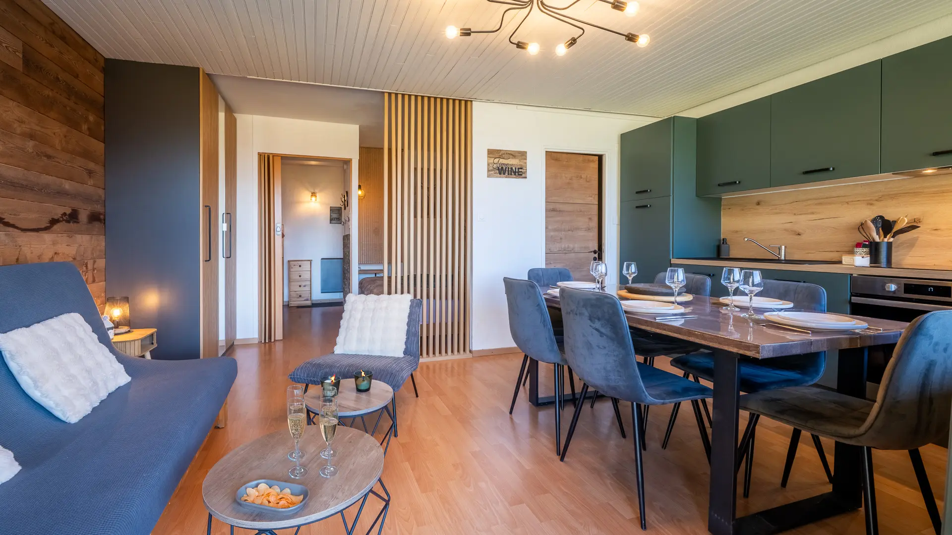 Conçu pour accueillir jusqu'à six personnes, notre appartement est composé d'un hall d'entrée avec 2 lits superposés (90x190cm) séparé de la pièce a vivre par une porte, d’une grande pièce de vie lumineuse, équipé d’un canapé convertible deux places (140x190cm), d’un coin nuit avec un lit deux places (140x200x30cm) et d'un lit parapluie pouvant accueillir une septième personne jusqu'à 3 ans. Le tout équipé avec couette et oreillers (60x60cm).