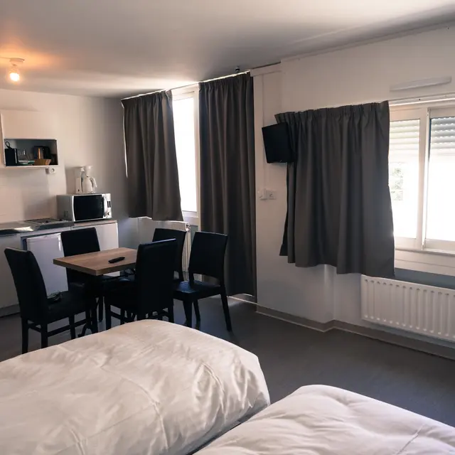 Studio situé sur l'aérodrome de Château-Arnoux-Saint-Auban avec kitchenette équipée, table, chaises, lits (couette et draps). Salle douche/WC privée. TV, rideaux et volets roulants, climatisation et wifi. Linge de lit et de toilette fournis.