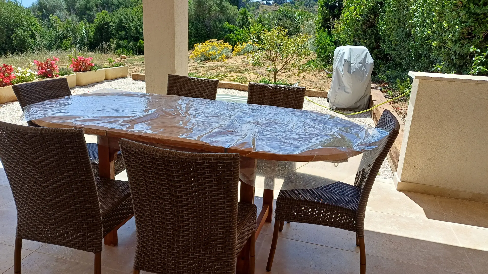 A L EXTERIEUR, VOUS POUVEZ PROFITER D UNE GRANDE TERRASSE DONT UN COIN OMBRAGE AMENAGE D'UNE GRANDE TABLE POUR VOS REPAS ET D UN COIN DETENTE.