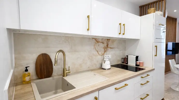 • Cuisine équipée (Four à micro onde, plaques induction, Bouilloire SMEG, Cafetière Nespresso, Machine à laver le linge, Réfrigérateur/congélateur, vaisselle et ustensiles de cuisine)