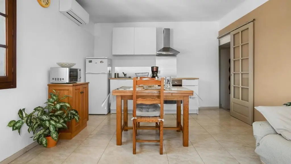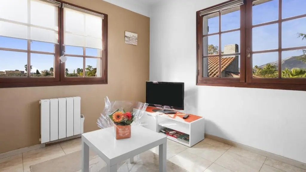 Ce studio se compose d’une grande pièce avec cuisine équipée (sauf lave-vaisselle), ainsi que d'un salon (canapé, table basse, télé). Cette pièce, très lumineuse comprend 2 fenêtres, l’une (plein sud) avec vue sur la cour et champ d’oliviers, l’autre (ouest) avec vue sur la campagne, le mont Coudon et le Mont Faron.
