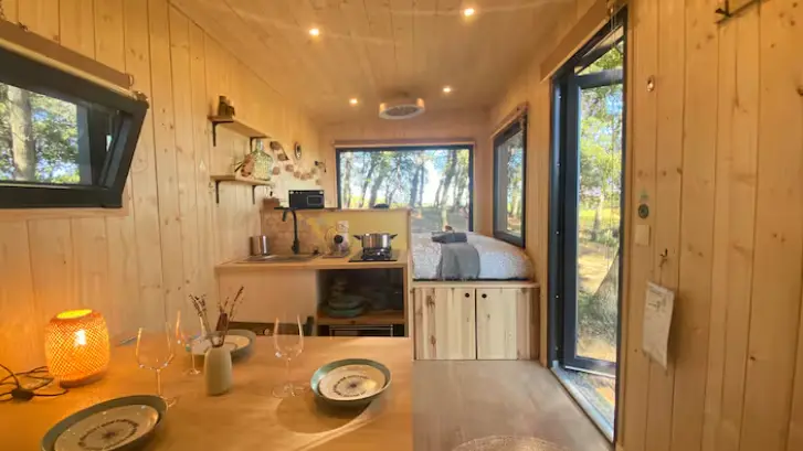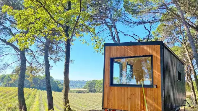 Située à Mondragon, au cœur du massif d’Uchaux, la Ferme Verdoulet propose un séjour dans deux tiny houses éco-conçues et autonomes, nichées dans un environnement naturel préservé entre vignes, pins et garrigue. Conçues pour 2 à 4 personnes, les tiny houses disposent d’un lit double, d’une banquette convertible, d’une cuisine équipée, d’une salle d’eau avec douche et toilettes sèches, ainsi que d’une terrasse privative ouverte sur les paysages provençaux.