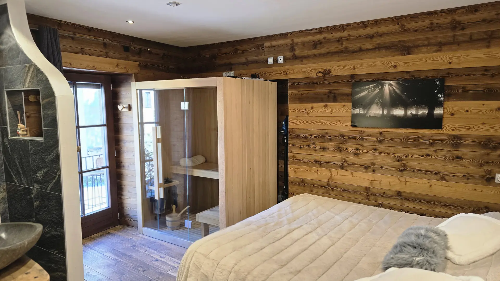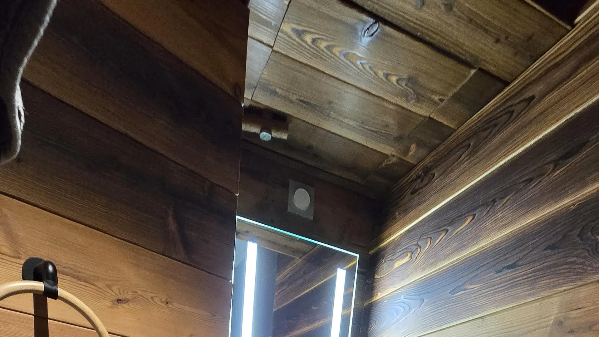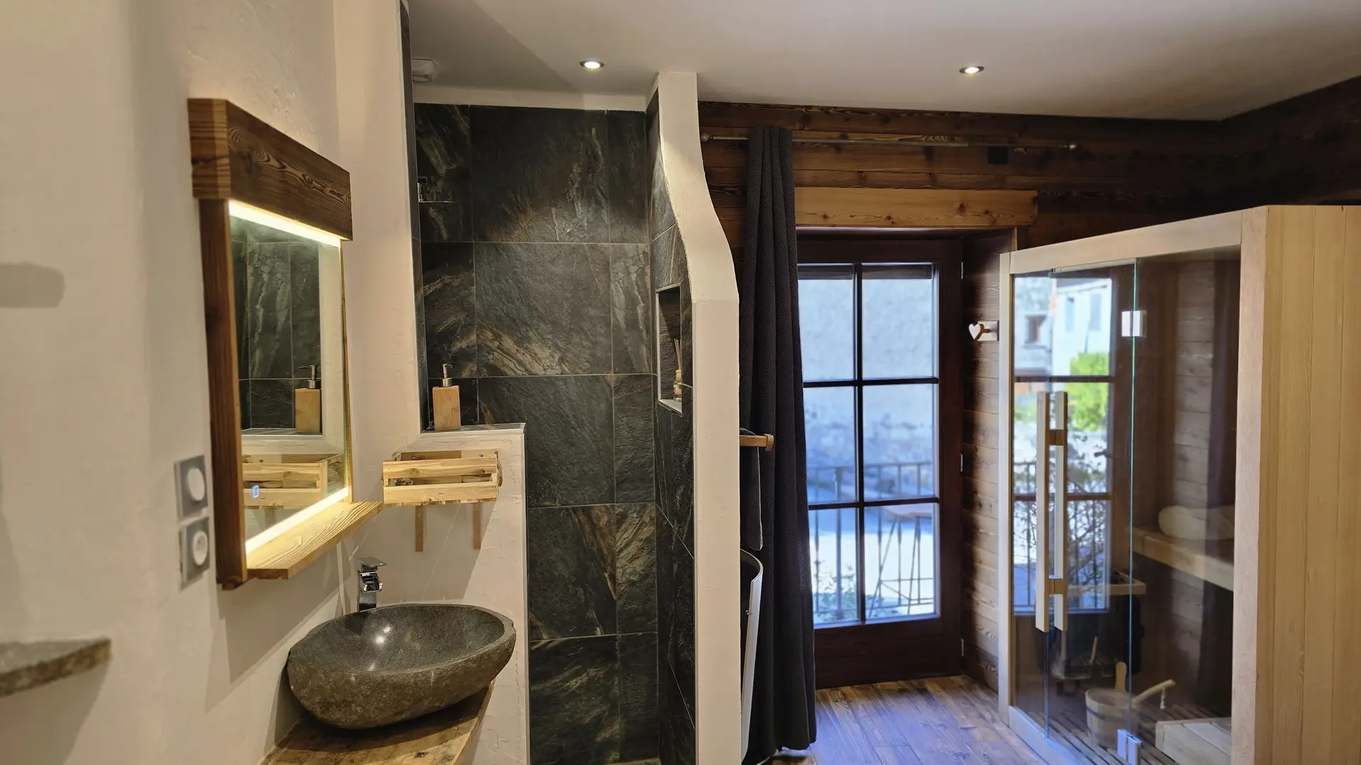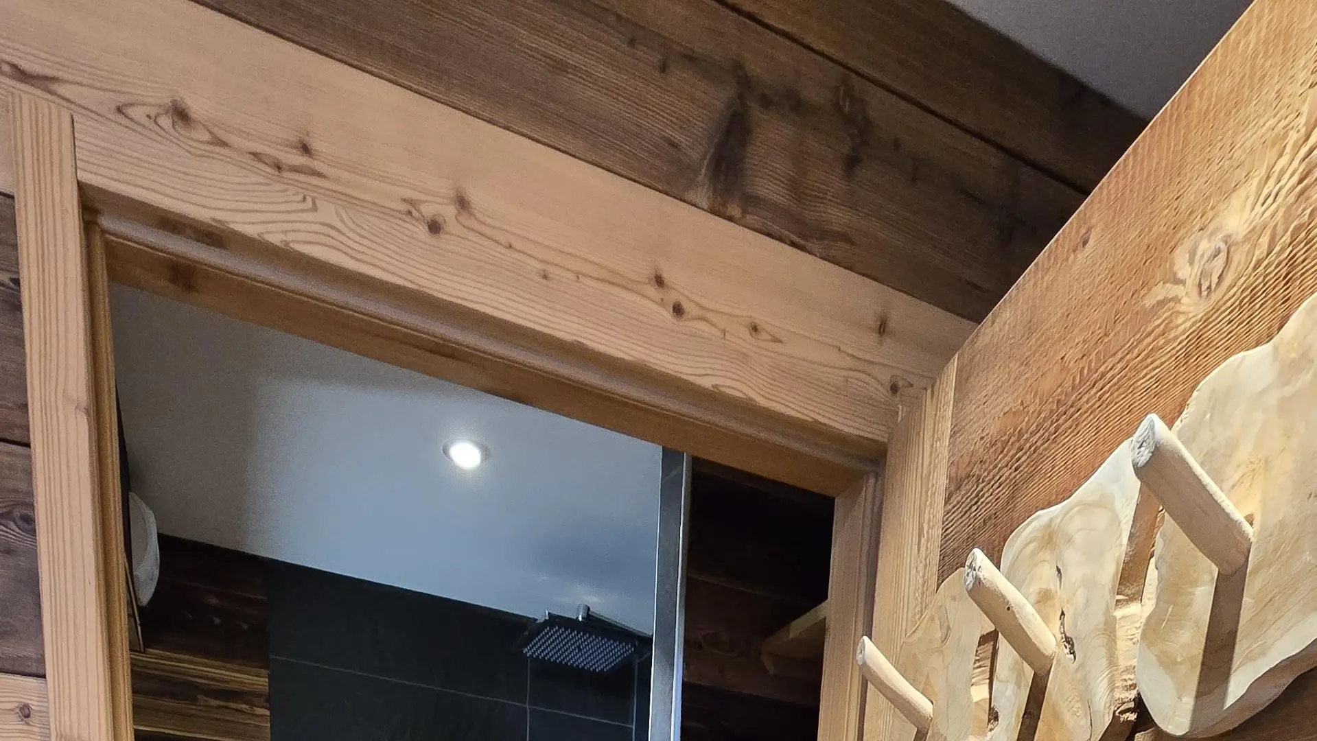 Douches à l'Italienne, sauna dans la chambre de Névacosy, mélèze, vieux bois, très chaleureux, ambiance montagnarde.