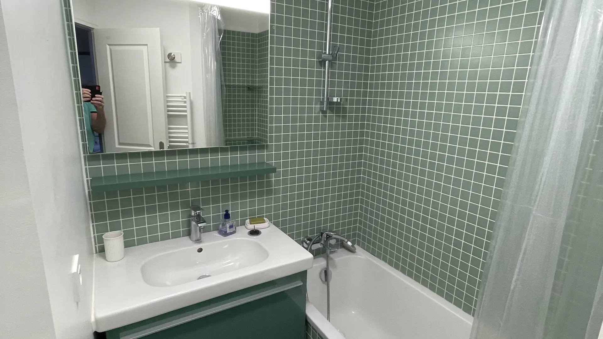 - Salle de bain avec baignoire, sèche-serviettes et rangements