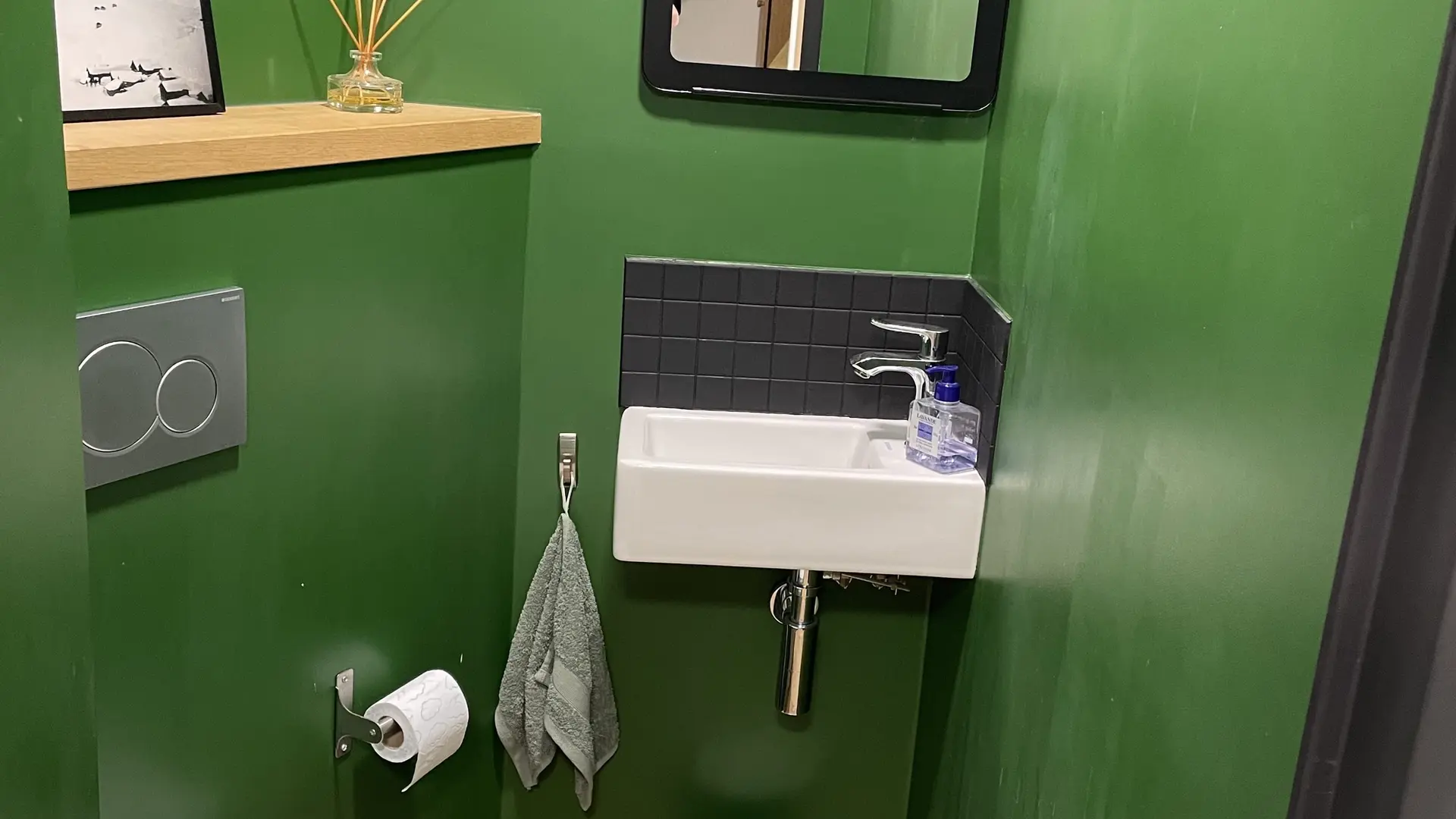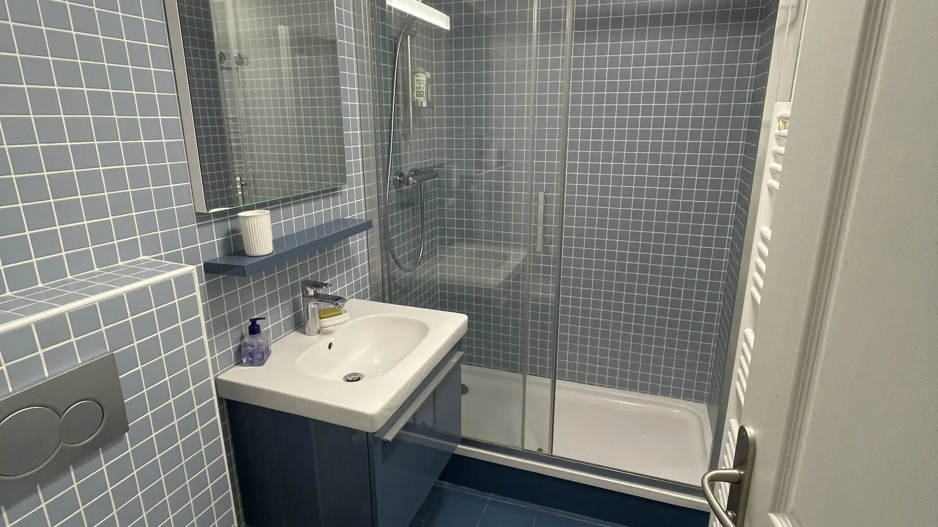 - Salle d'eau avec douche à l'italienne, WC, sèche-serviettes et rangements.