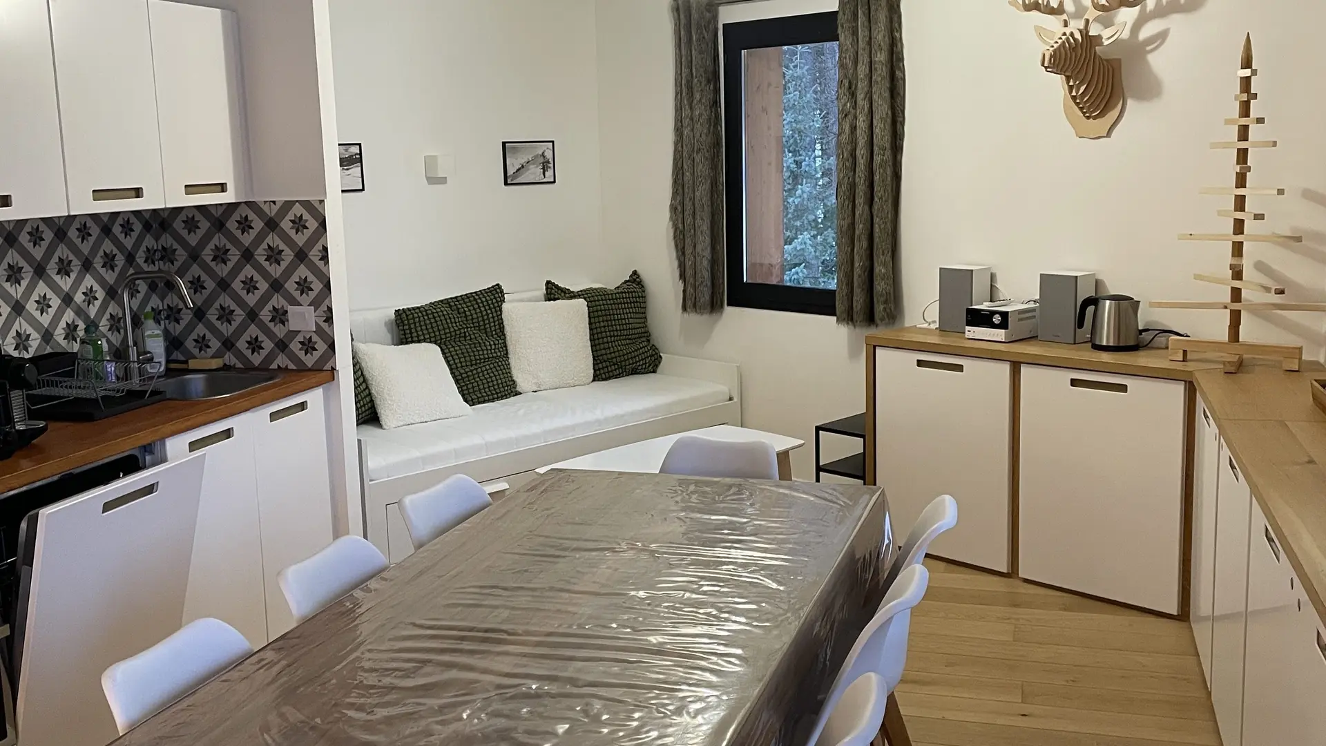 - Grand salon lumineux avec 3 fenêtres, comprenant, un canapé en L, une cuisine ouverte, une salle à manger et un deuxième coin salon avec un lit tiroir (80x200 jusqu'à 160X200). De nombreux rangements pour un espace optimisé.