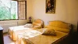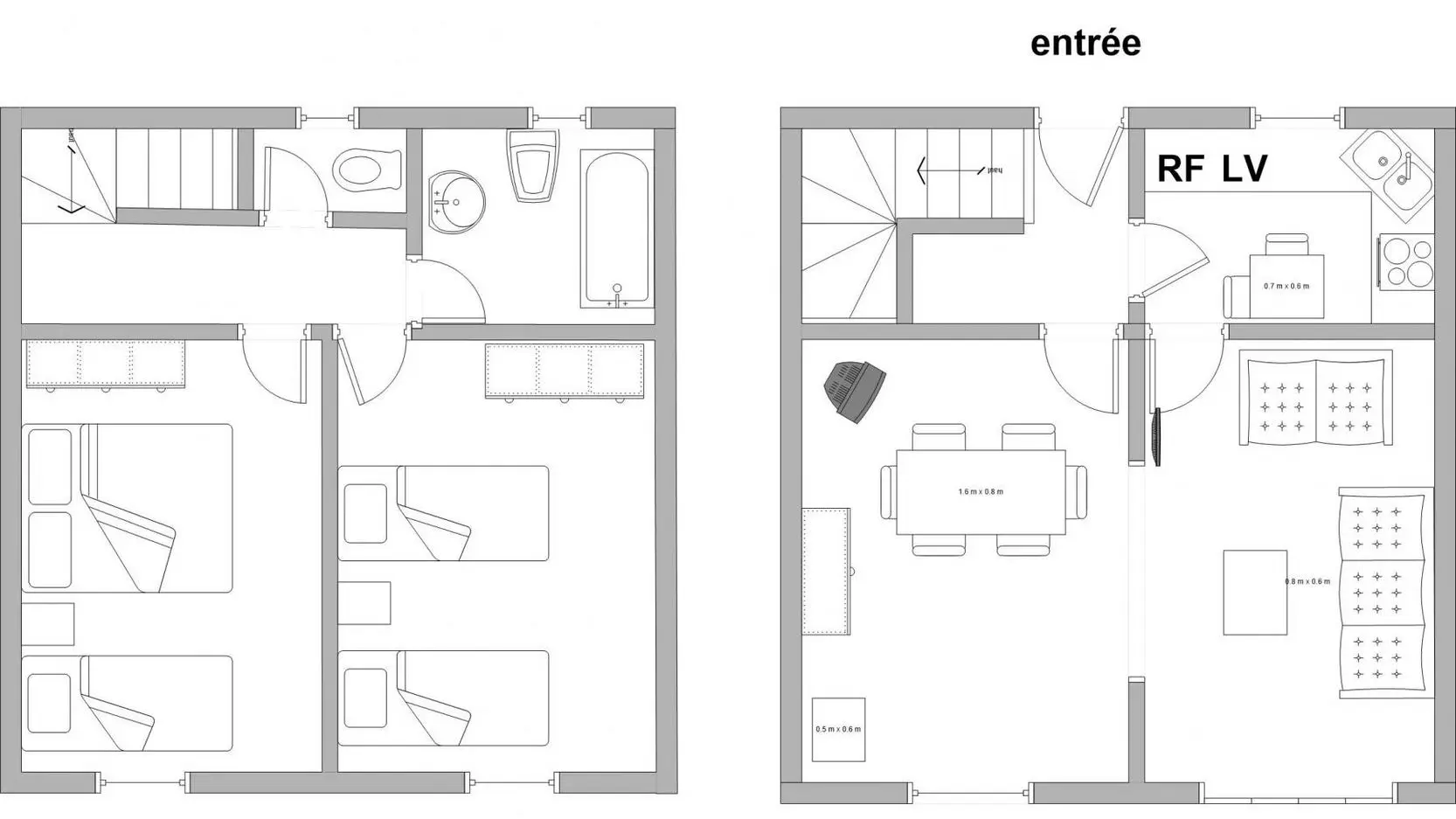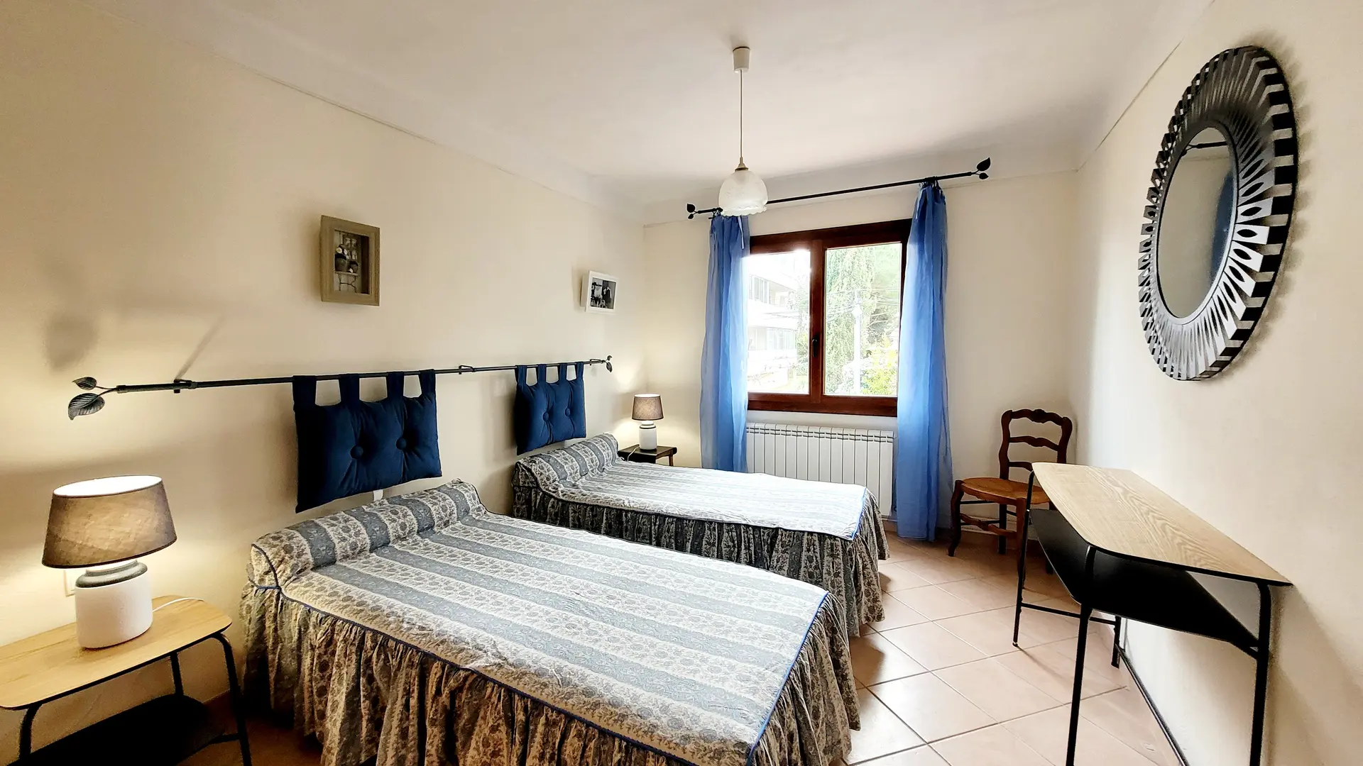 Conçue pour accueillir jusqu'à 5 personnes, cette villa offre à l'étage deux chambres : une première avec un lit double (140 cm) et un lit simple (90 cm), et une deuxième avec deux lits simples (90 cm chacun).