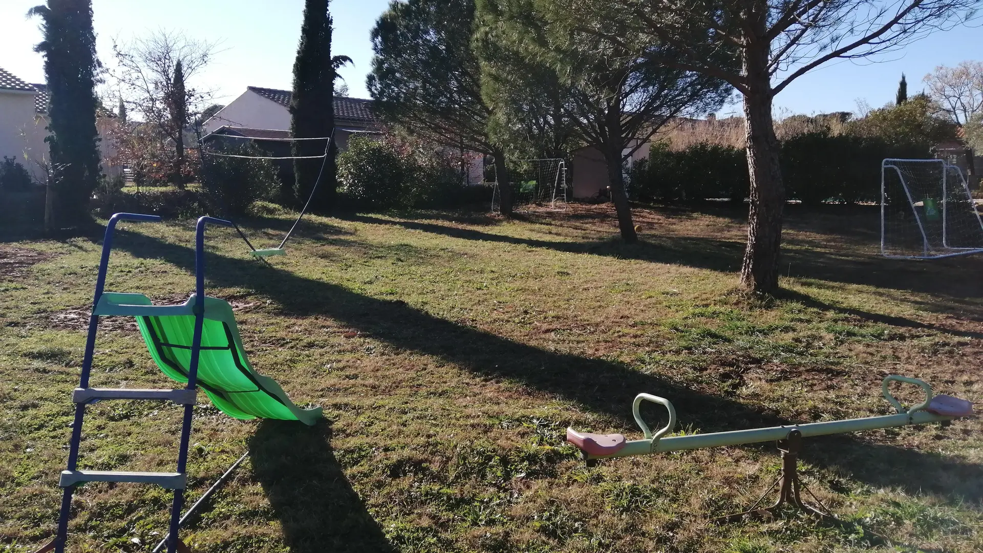 JARDIN de 2400 m2 avec jeux pour enfants: tyrolienne 50kg max, trampoline, cabane, toboggan, trébuchet, 2 grandes cages de foot, filet volley, coffre avec ballons mousse, fléchettes, raquettes, boules de pétanques...