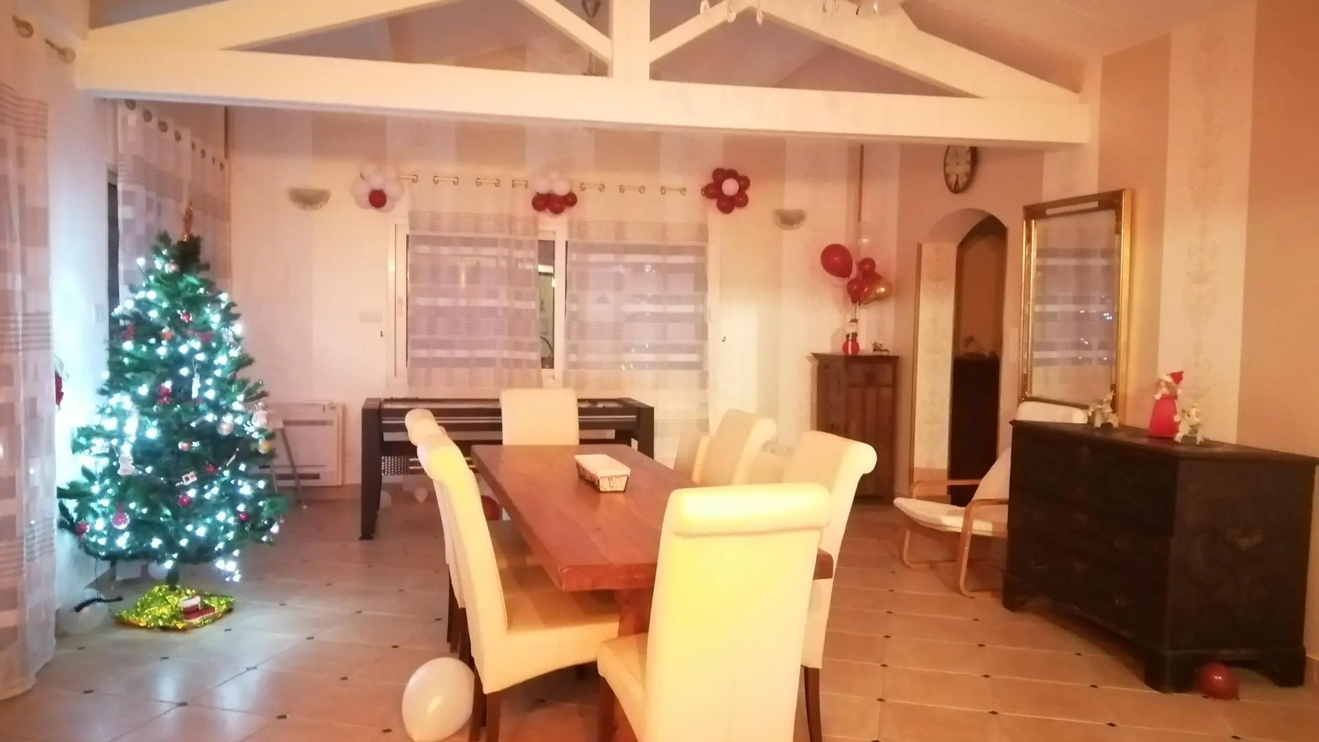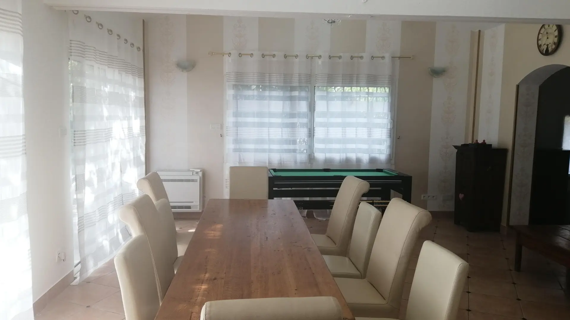 Grand SEJOUR lumineux climatisé avec billard ouvert sur salon et cuisine équipée, baies vitrées donnant sur terrasse vue piscine et jardin.