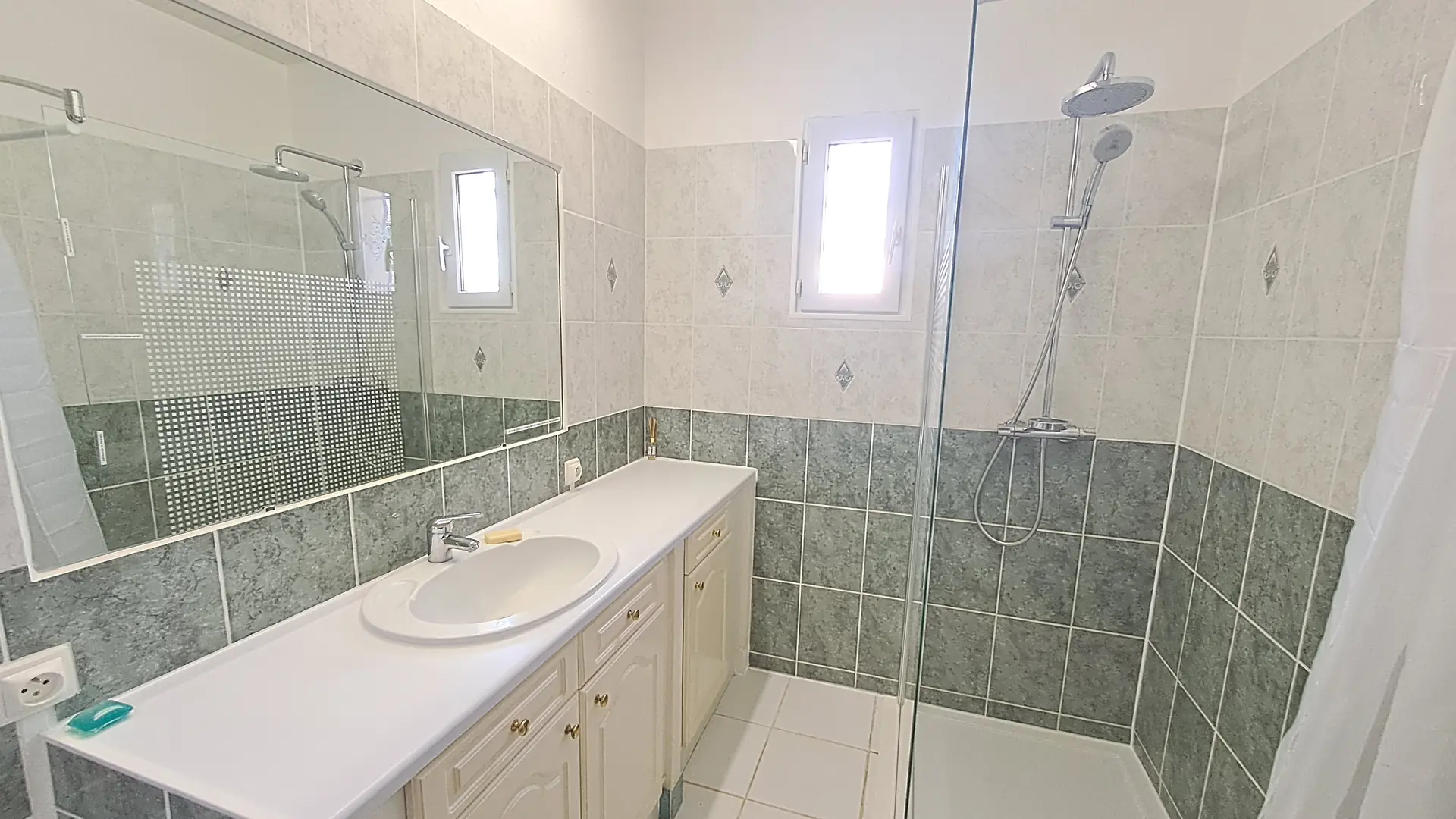 1 Salle d'eau au rdc avec grande douche à l'italienne, vasque, miroir, lave linge, sèche linge.