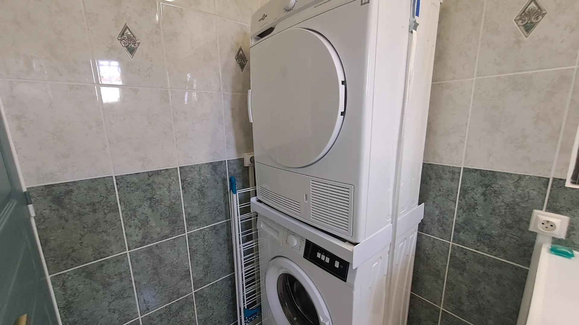 avec placard comprenant tout le nécessaire de ménage (produits, aspirateur, serpillère, balai, table à repasser, fer...)