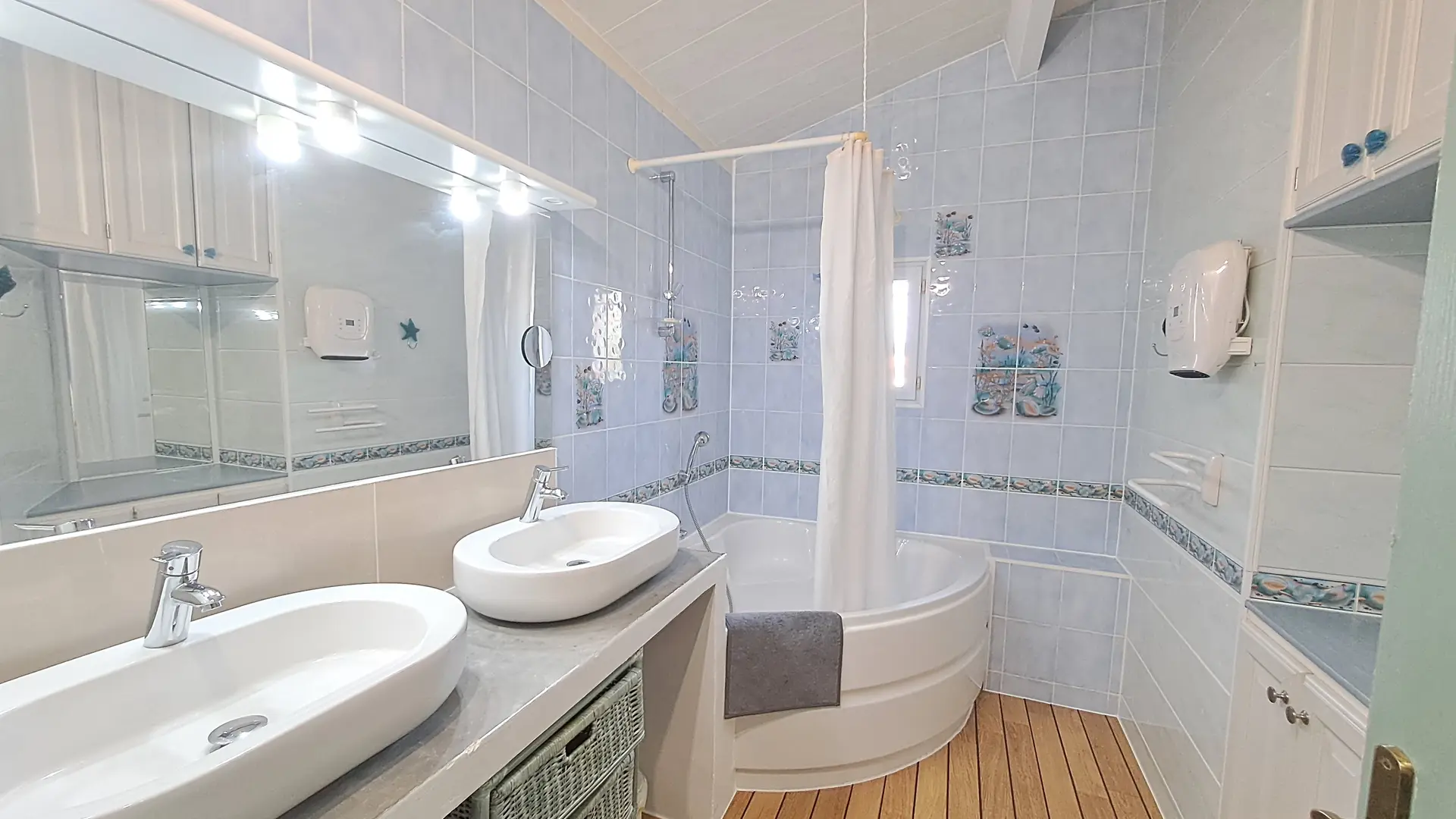 1 Salle de bain à l'étage avec baignoire d'angle, double vasque, miroirs, sèche cheveux.