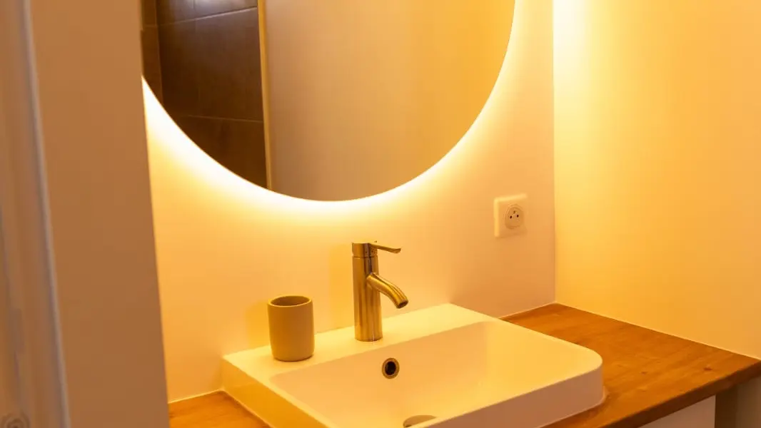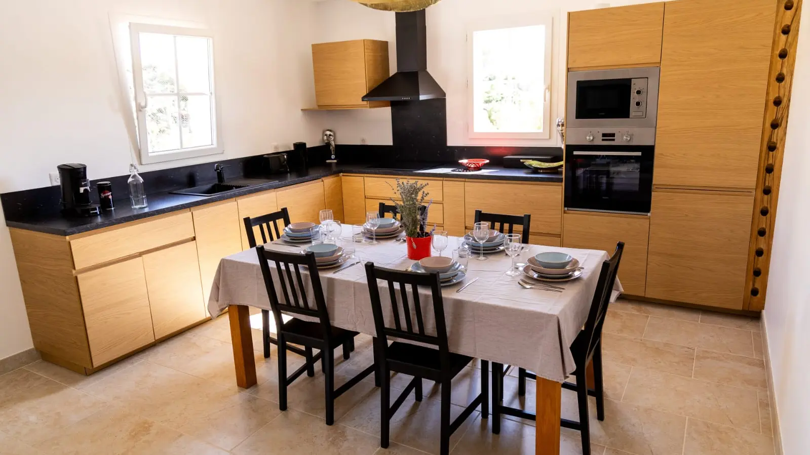 La cuisine, entièrement équipée, permet de préparer des repas conviviaux, tandis que la pièce à vivre, baignée de lumière, invite à la détente en famille ou entre amis. Chaque espace a été pensé pour offrir une ambiance douce et harmonieuse, en parfaite continuité avec l’extérieur.
