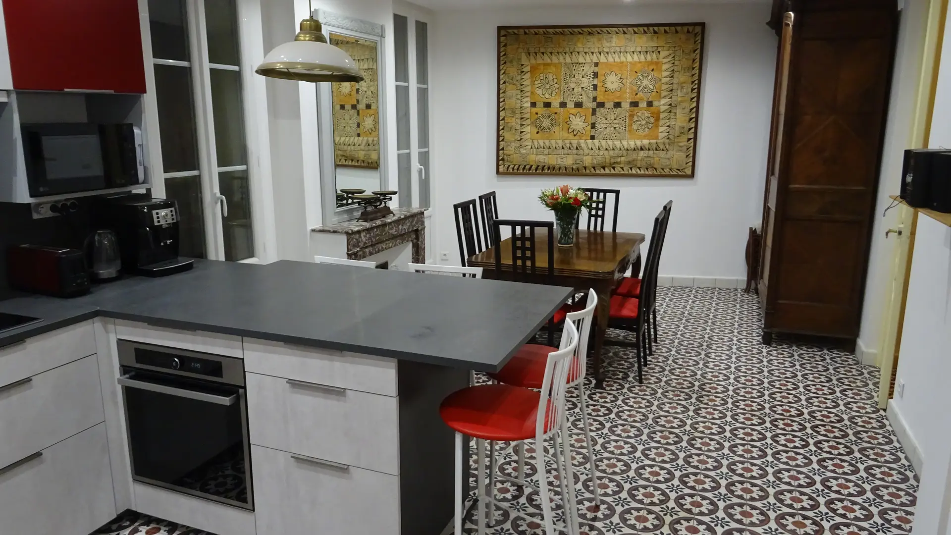 Au rez-de-chaussée : nouvelle cuisine équipée ouverte sur pièce à vivre de 37 m² : lave-vaisselle, four, micro-ondes, grand frigo avec compartiment congélateur, café à capsule, grille-pain, bouilloire électrique, robot cuiseur ...