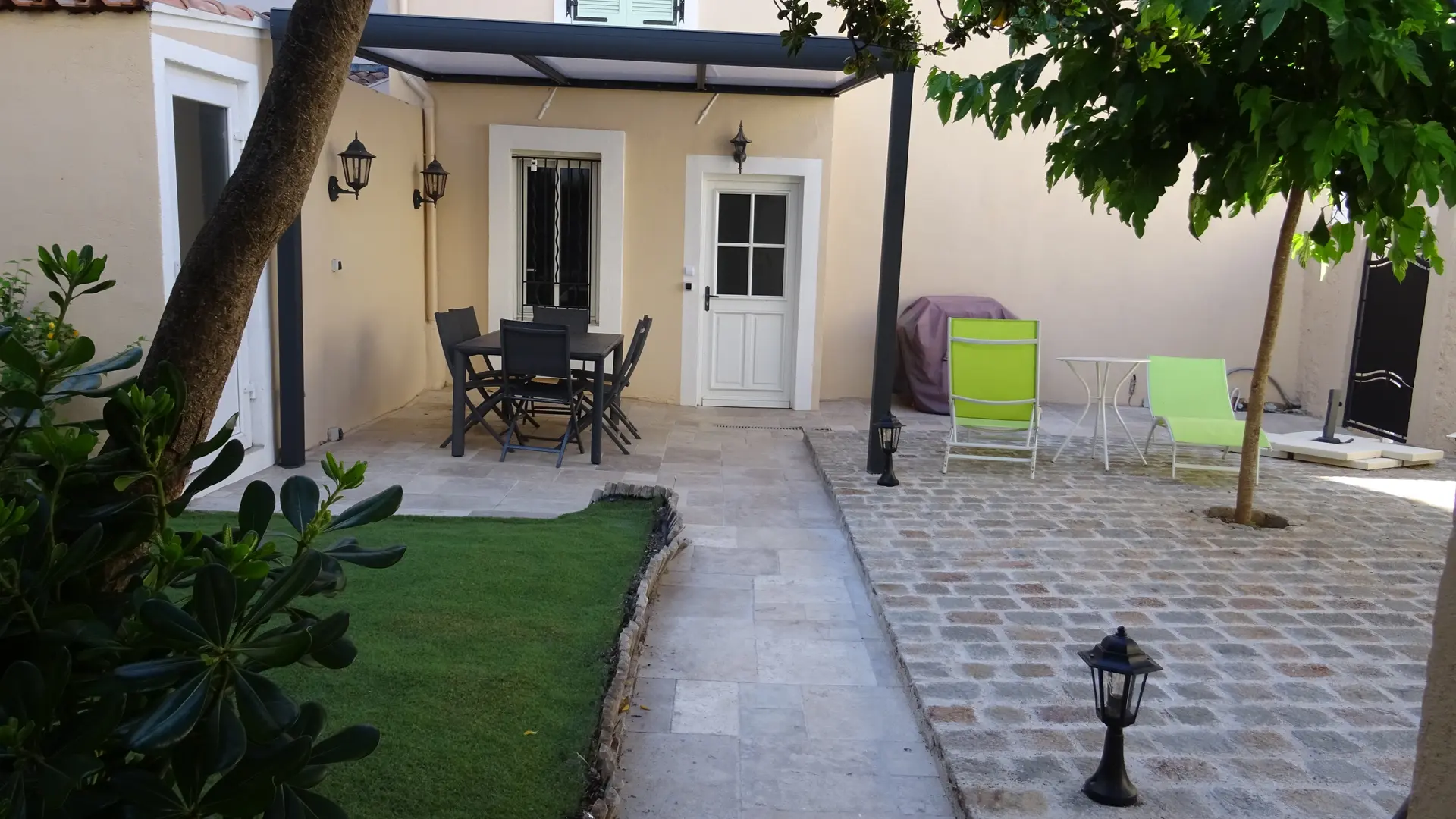 Jardin arboré de 125m2 avec pergola équipée d'une plancha pour 10 personnes et coin repas.
