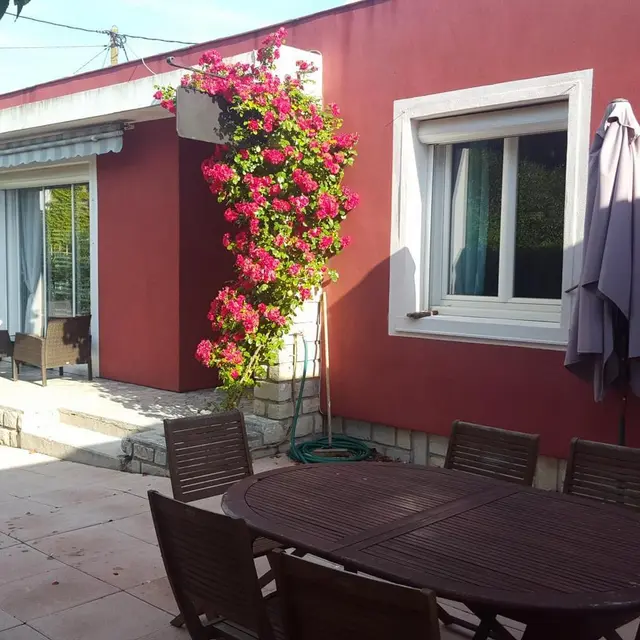 Sur 500 m² de terrain disposant d'une piscine clôturée et sécurisée (6 x 4 - profondeur 1.5 m) ouverte du 15 mai au 30 septembre, d'une terrasse sur le devant de la maison, d'un jardinet sur le côté. Entièrement en rez de chaussée : salon/salle à manger ouvrant sur la terrasse avec coin repas, coin détente avec télévision écran plat (100 cm), lecteur DVD. Cuisine américaine intégrée avec plaques vitrocéramiques (4 feux), four, micro ondes, frigo/congélateur, lave vaisselle, petit électroménager (cafetière à dosettes), rangements. Accès à la buanderie (lave linge) et porte ouvrant sur l'espace piscine clôturé. 2 chambres avec 1 lit 2 personnes (140x190), une chambre avec 2 lits superposés (90x190 - pour enfants). Salle d'eau avec douche italienne. Wc indépendant. Wi-fi ( box). Climatisation réversible (chambres et salon - consommation réelle) - kit linge sur demande (draps + linge de toilette 15EUR par personne) - ménage sur demande (80EUR). Barbecue. Salon de jardin côté terrasse.