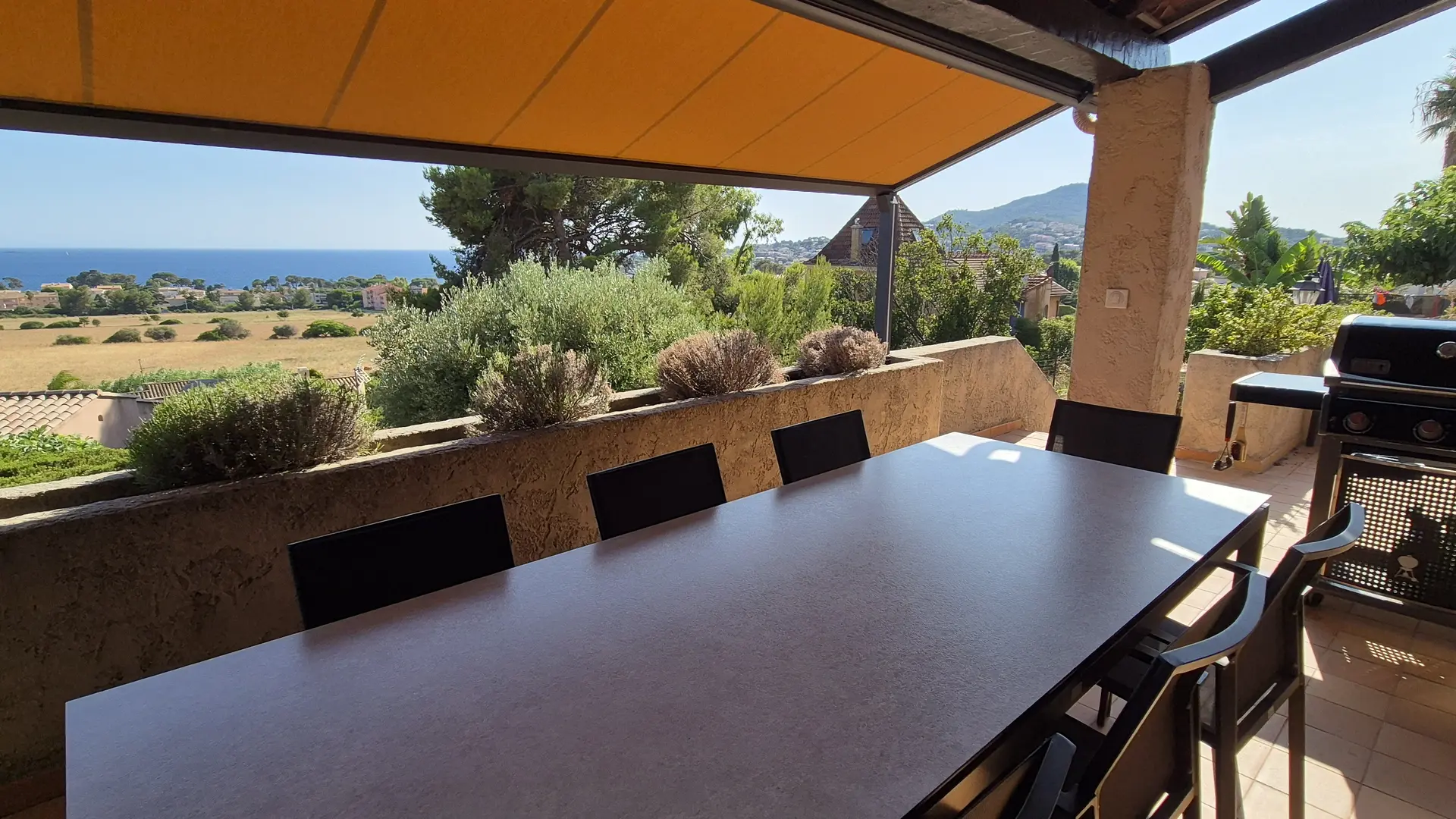 Terrasse avec grande table et fauteuils pour 8 personnes, barbecue à gaz. Pergola avec toile enroulable pour plus de fraicheur.