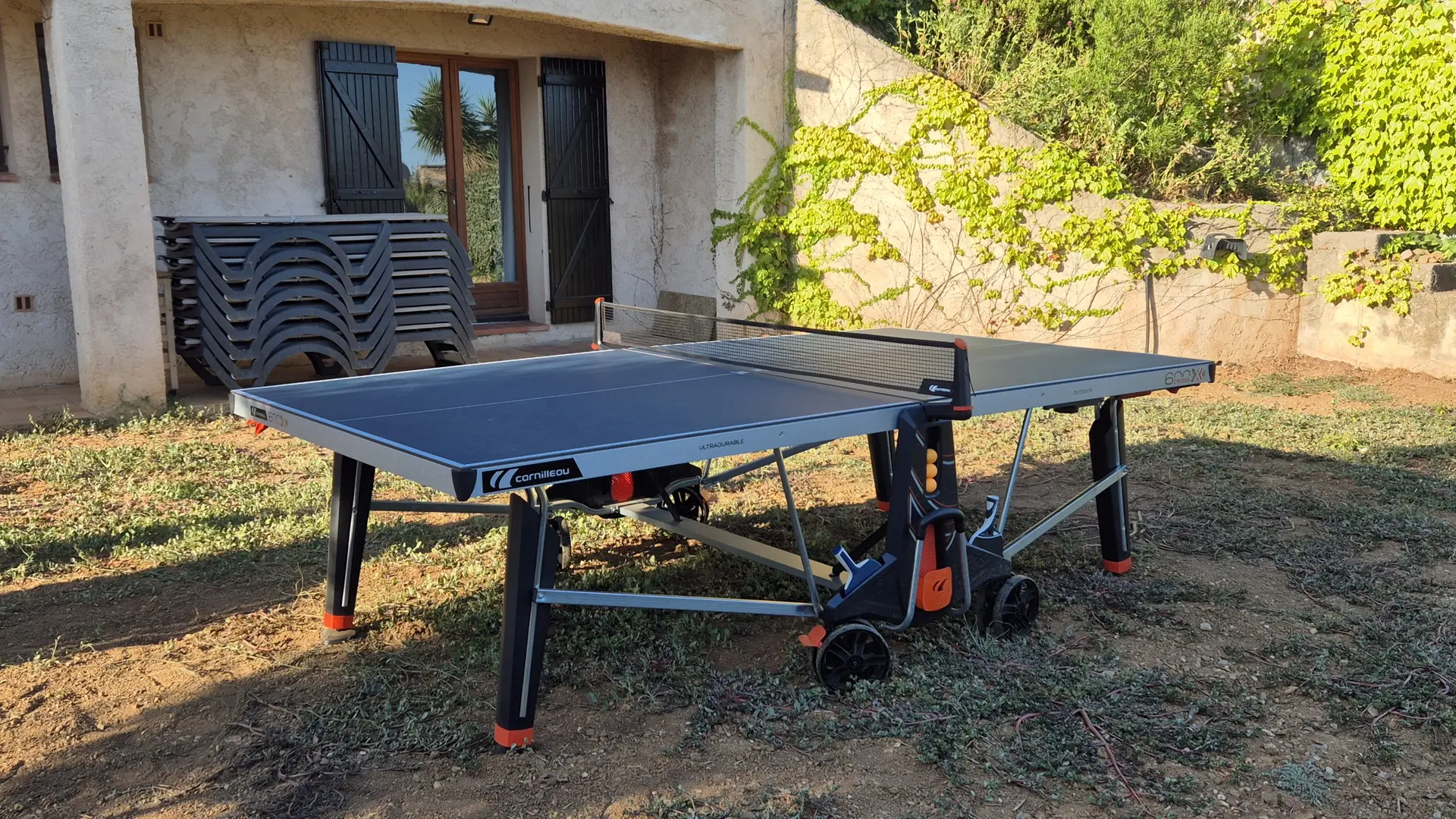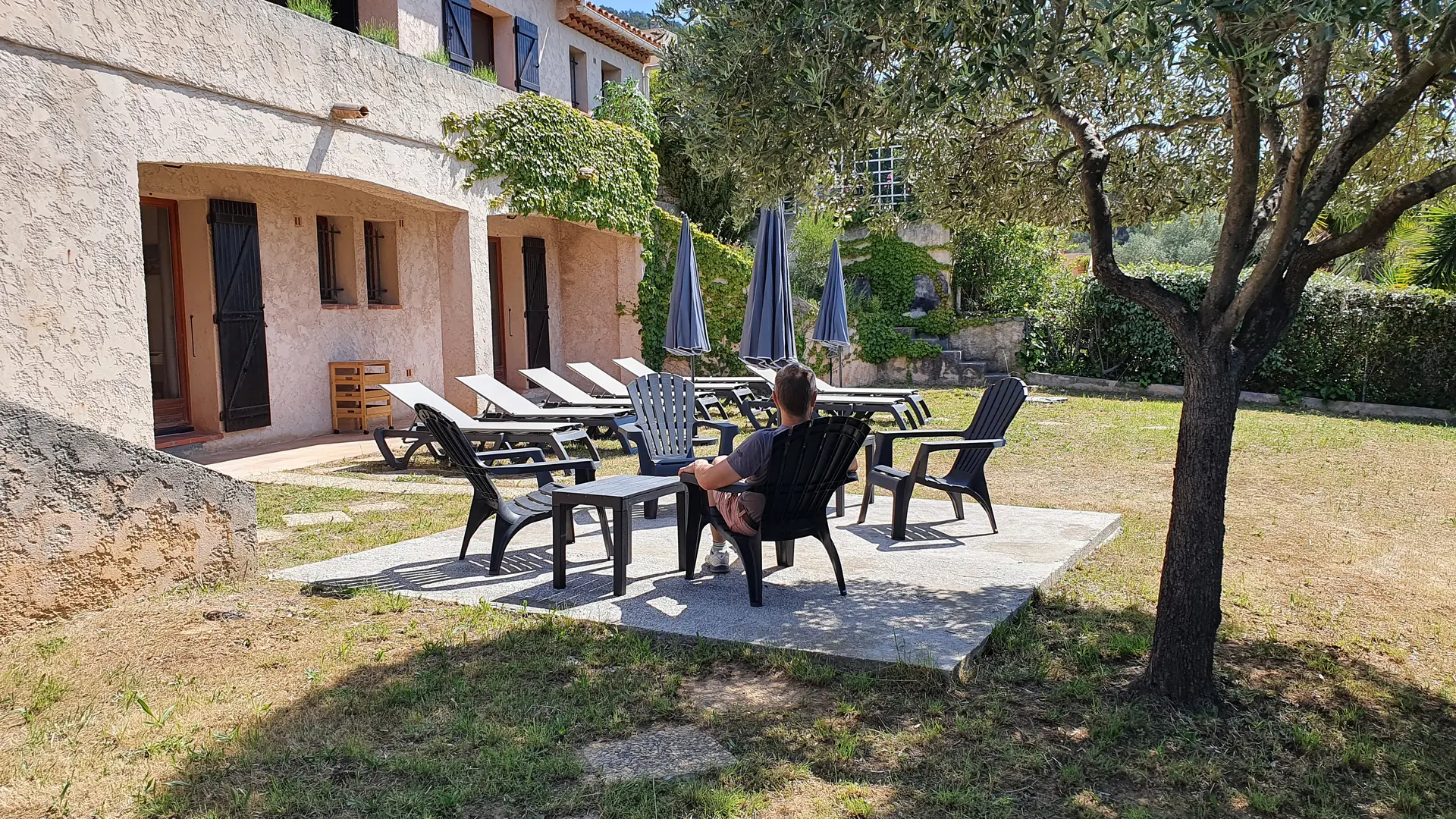 Grand jardin avec bains de soleil, chaises de détente et parasols. Table de pingpong