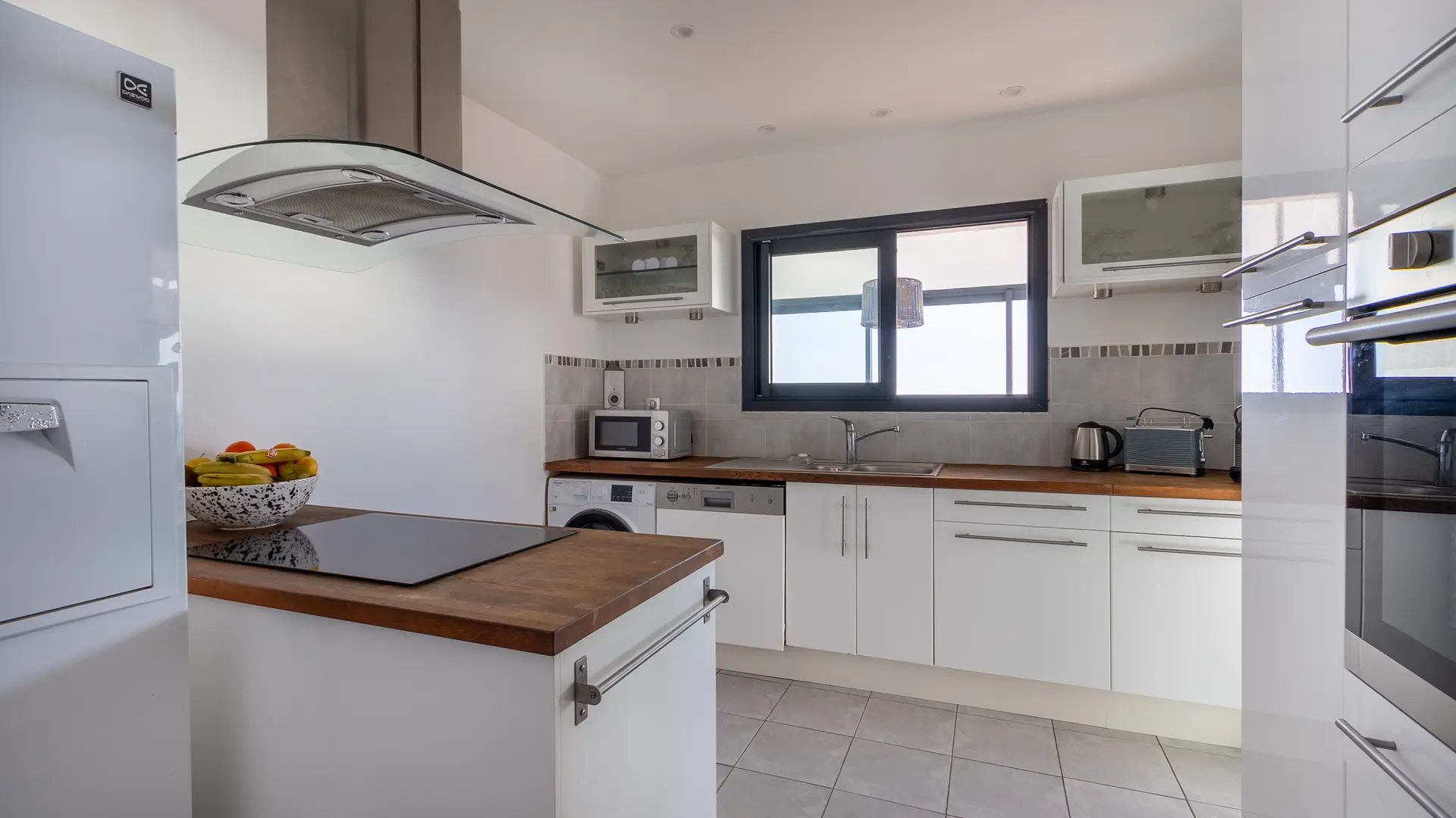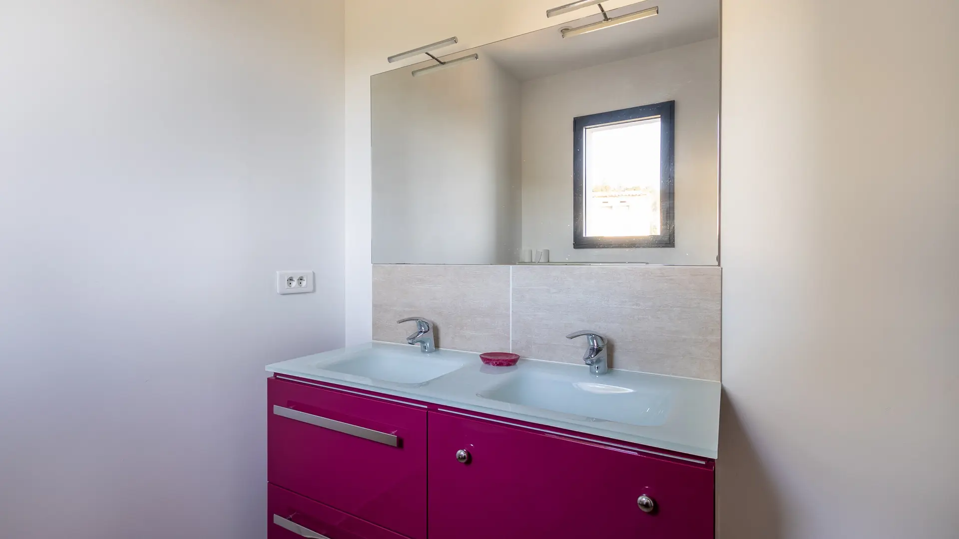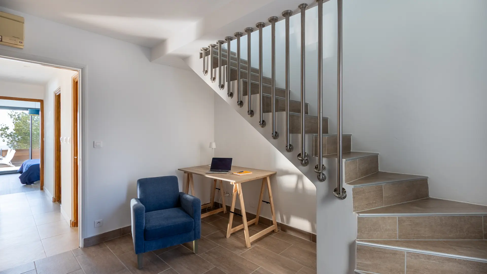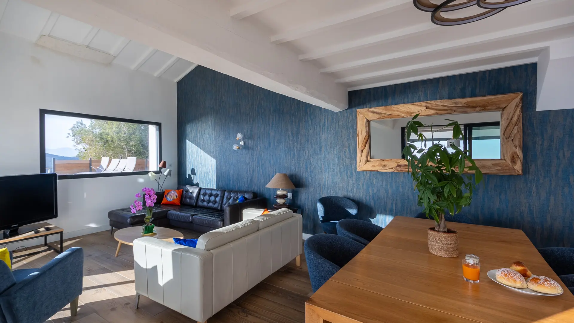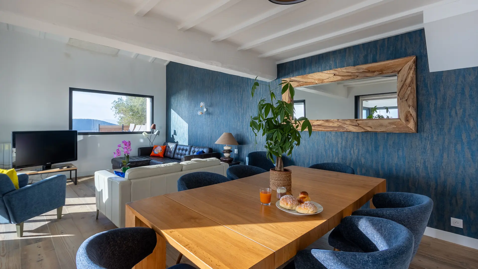 Les tables intérieures et extérieures accueillent 8 convives, en revanche nous avons 10 couchages et nous pouvons louer la villa pour 10 personnes s’il y a des petits enfants.
