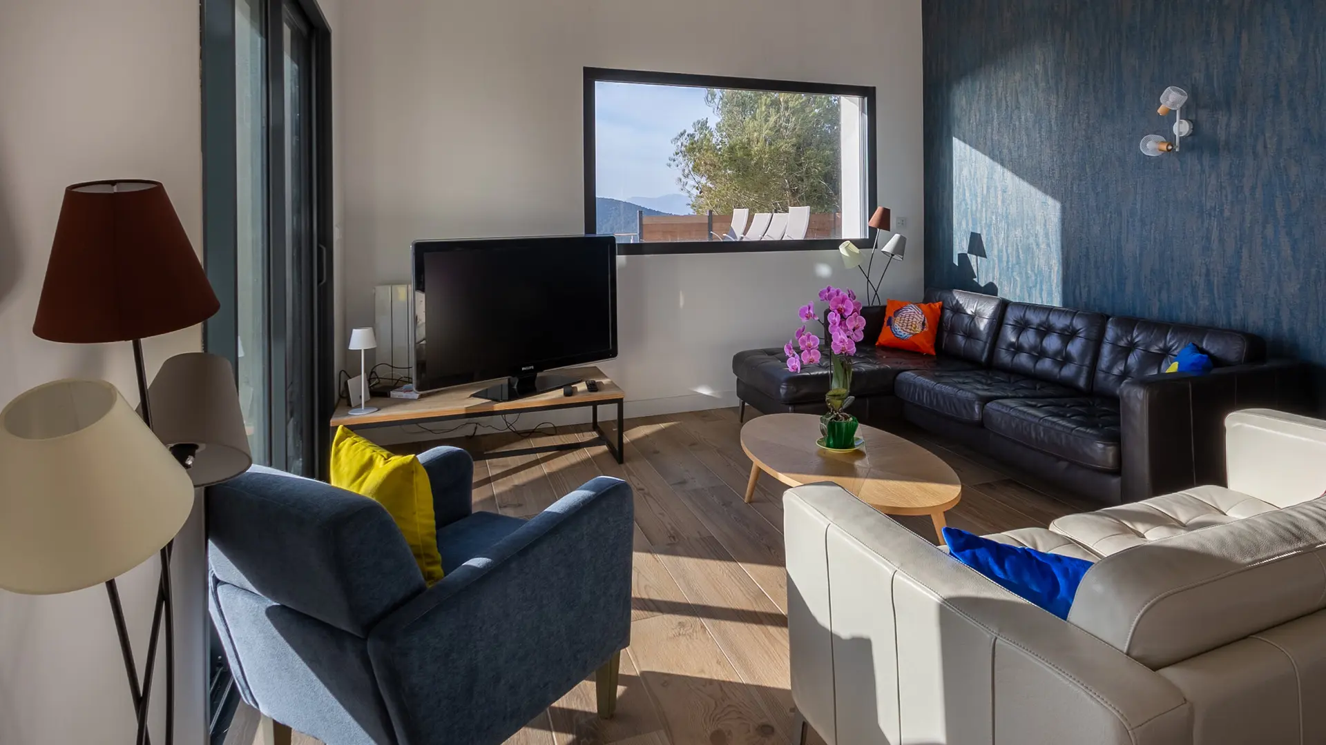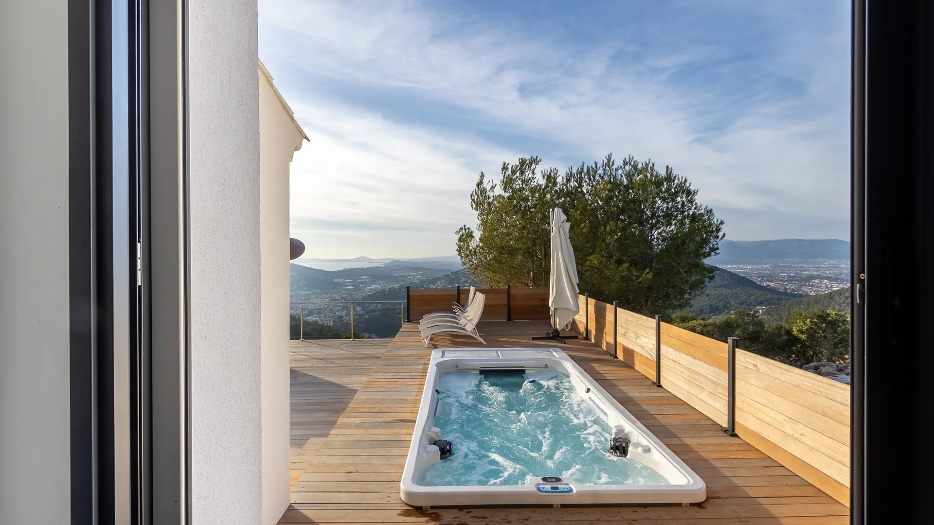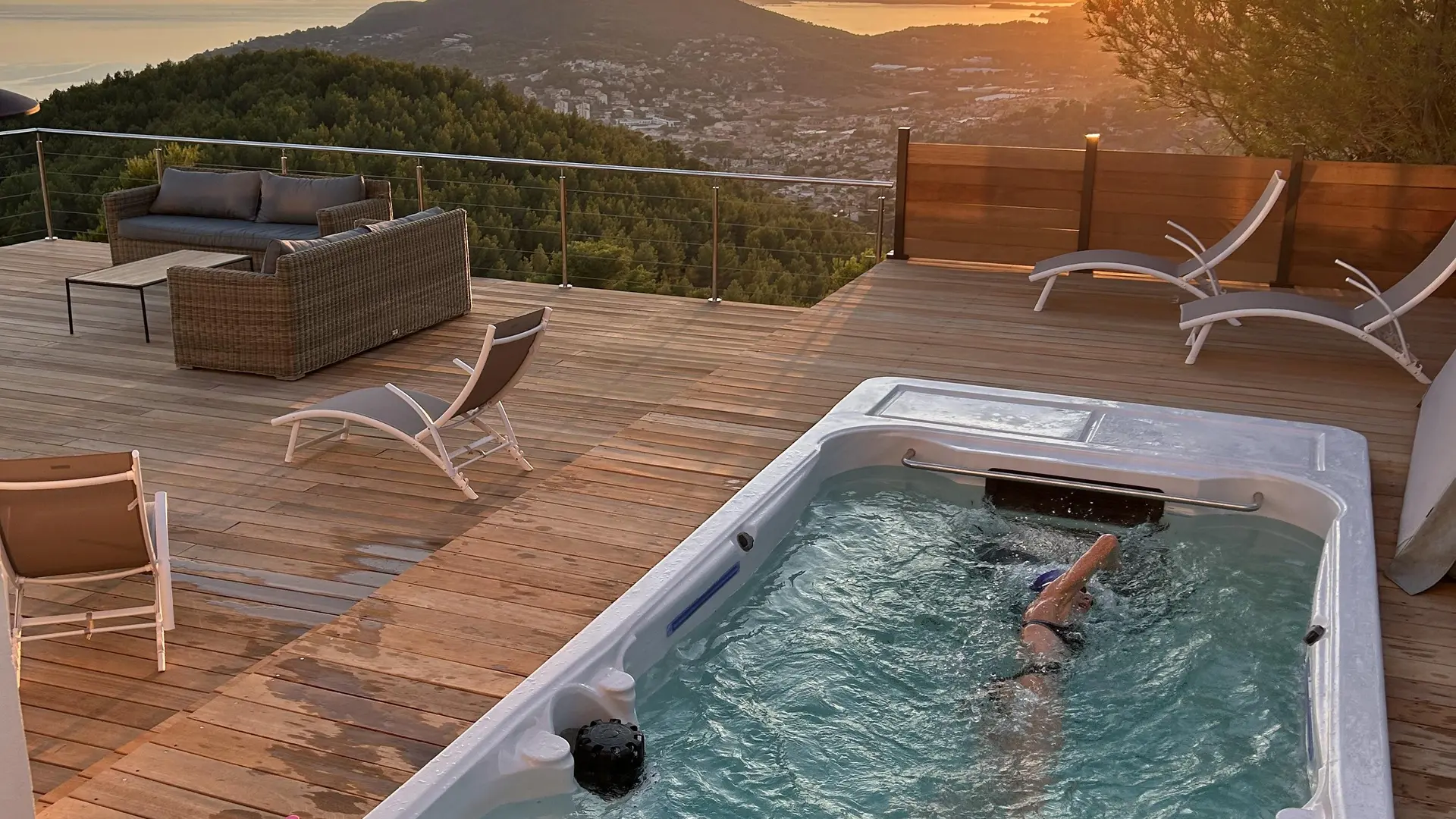 Location d'une Villa - 8 Personnes – séjour climatisé et verrière avec vue mer panoramique à plus de 180 °- 4 chambres - 2 salles d'eau - Wifi & climatisation – bassin de nage – exposition Sud-Ouest – terrain clos
