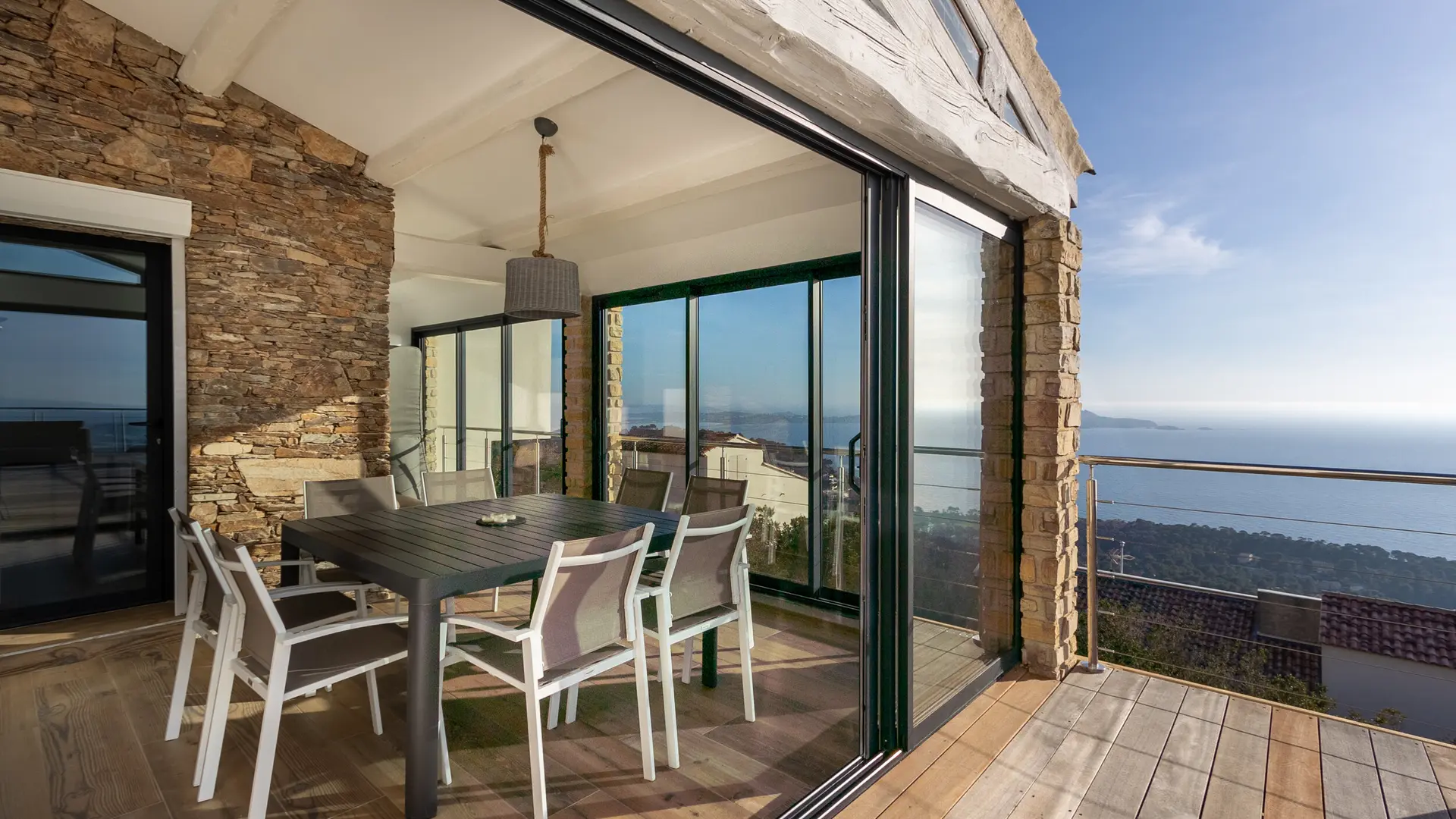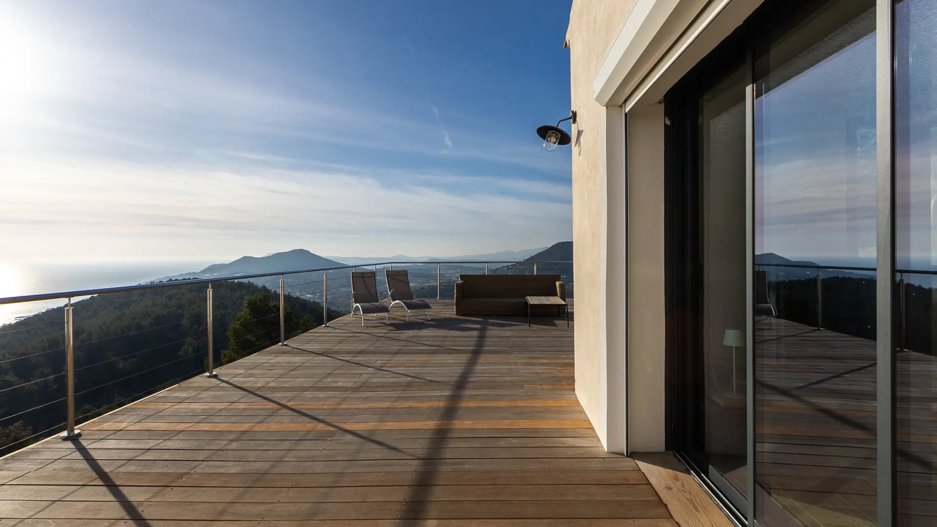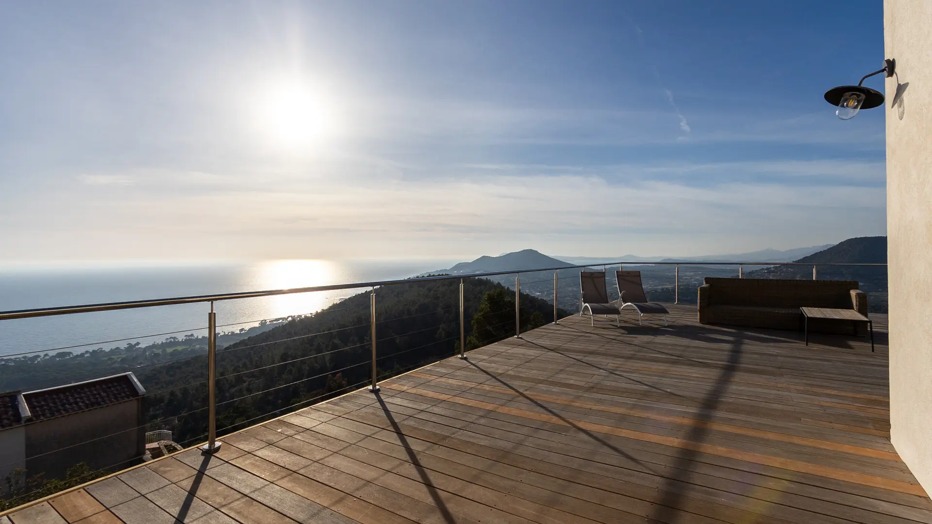 Vue réellement unique accentuée par la création d’une terrasse suspendue de 120m2 (une vue mer à perte de vue comme un roof top au milieu de nulle part !).