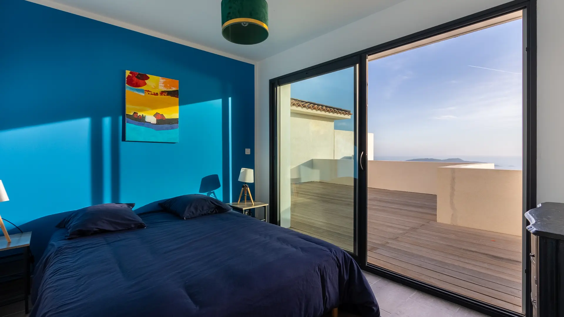 • Une chambre climatisée avec tropézienne de 30 M2 vue mer, un lit 160