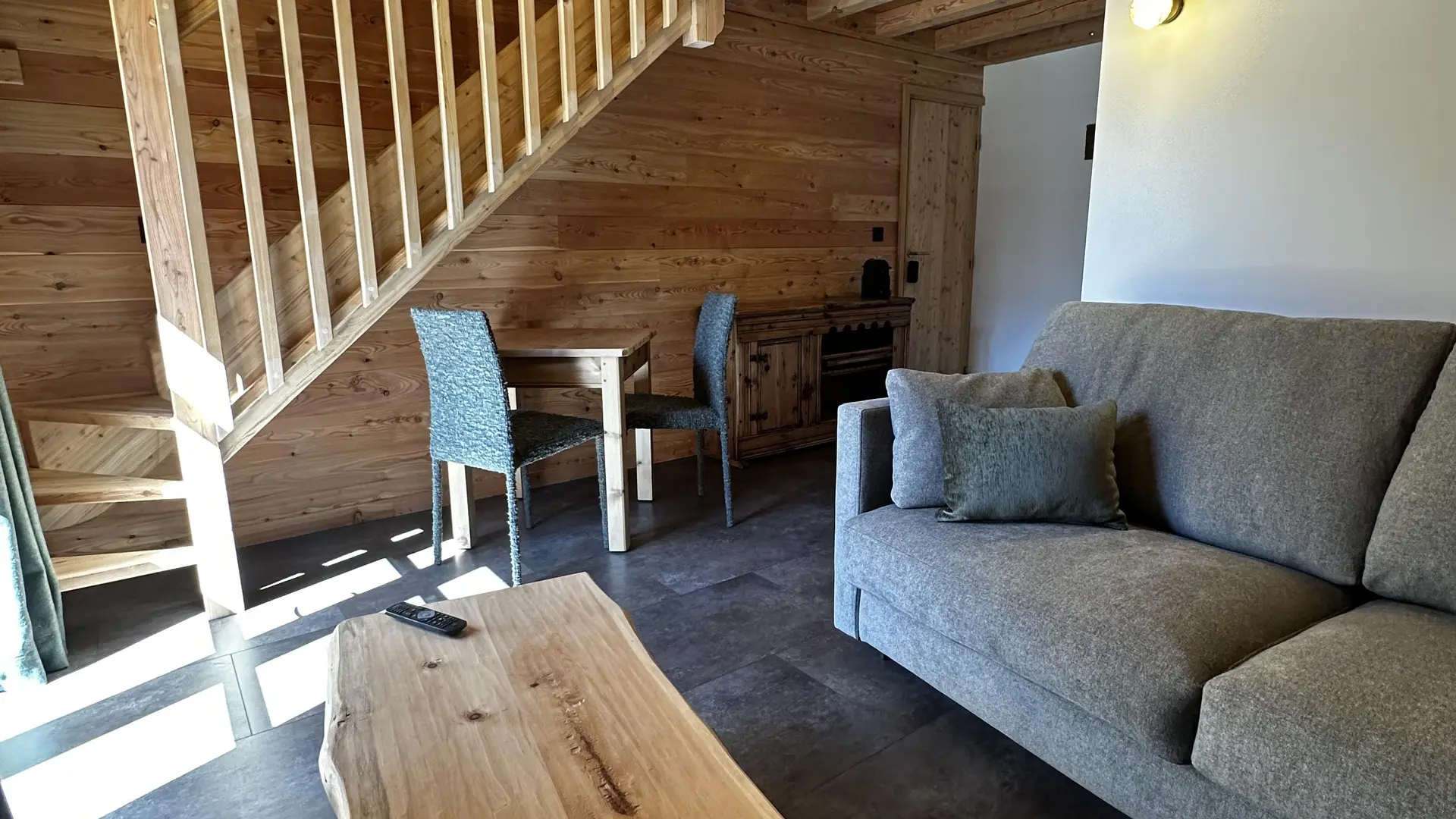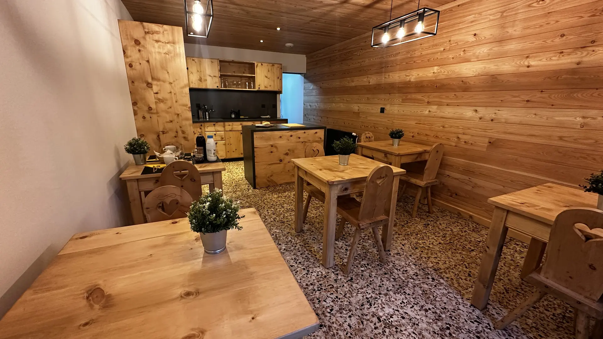 Au RDC, vous pourrez préparer et prendre vos repas dans une grande cuisine et salle à manger de style montagnard.